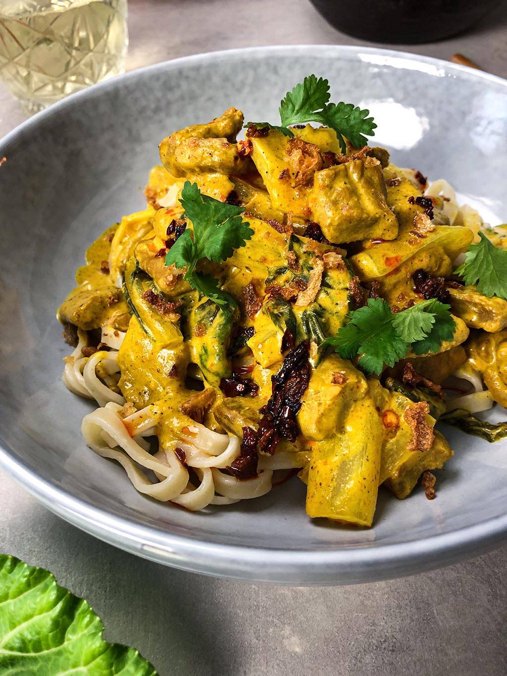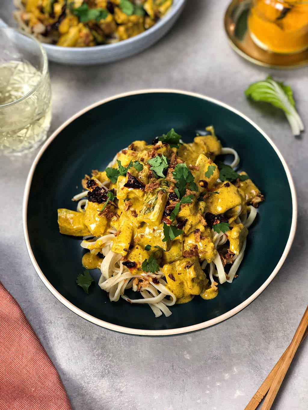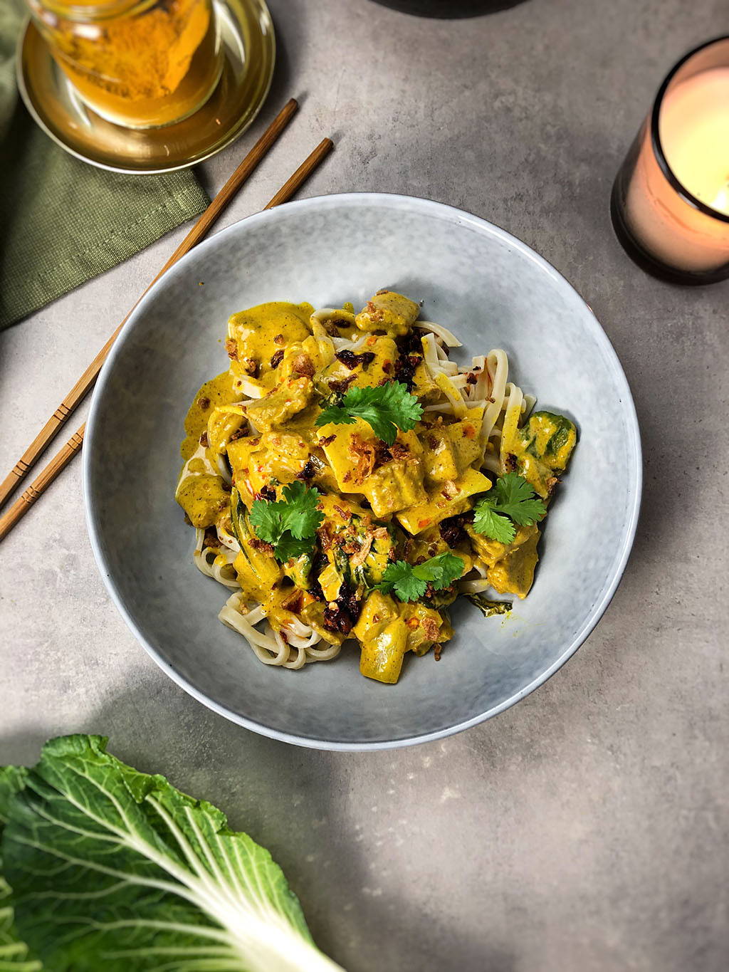 Wir haben dieses Rezept Curry-Nudeln genannt, weil es Nudeln und, wie du bereits erraten hast, auch Curry enthält. 😉 Wir haben uns dafür entschieden, die Currysauce mit roter Currypaste und Currypulver zuzubereiten. Diese Aromen passen sehr gut zur Kokosmilch, die wir hinzufügen. Herrlich cremig und samtig. Wir fügen noch etwas Pak Choi hinzu und essen es mit Mie-Nudeln.
