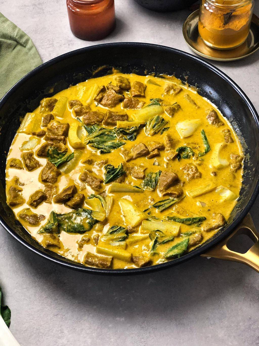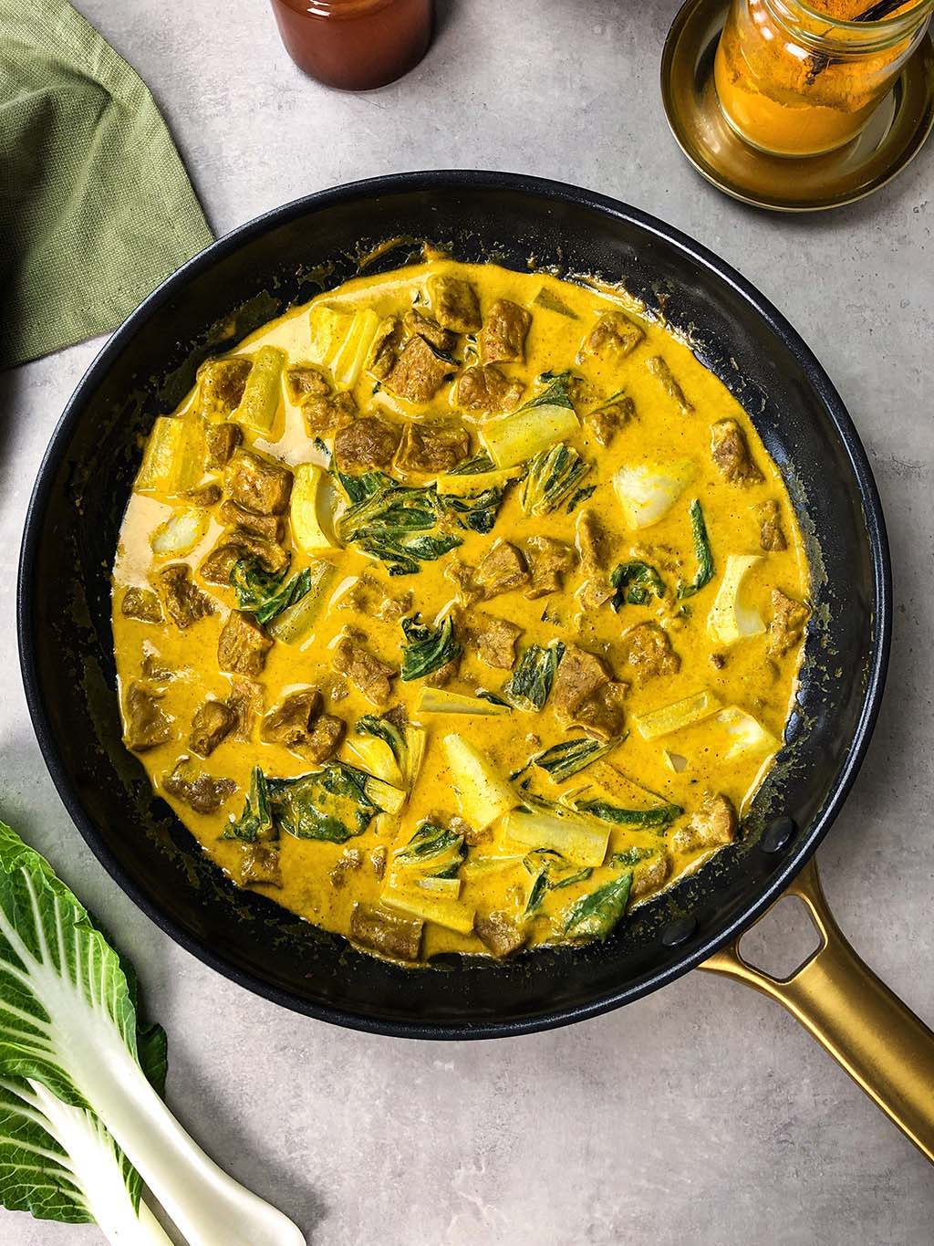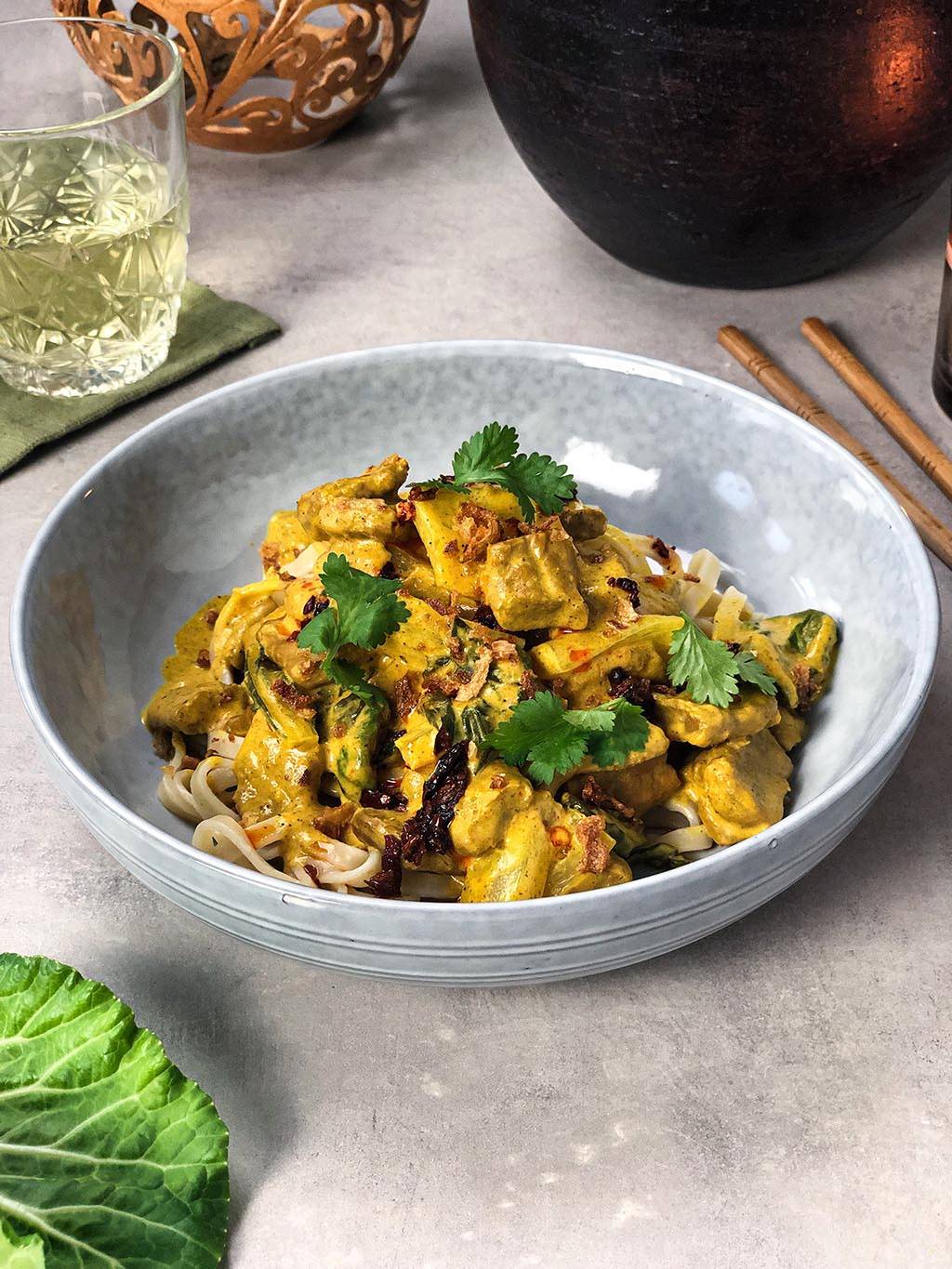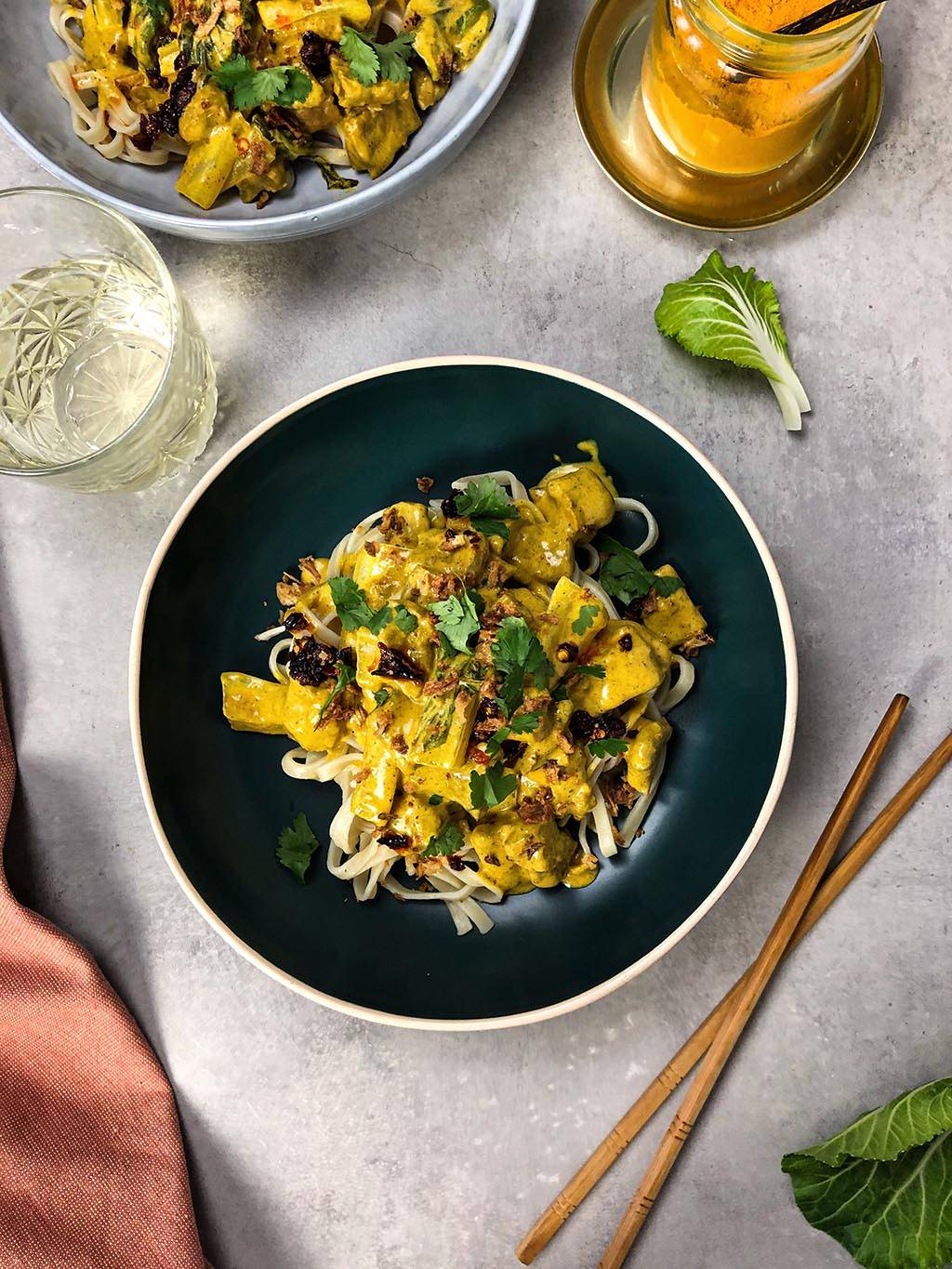 Wir haben dieses Rezept Curry-Nudeln genannt, weil es Nudeln und, wie du bereits erraten hast, auch Curry enthält. 😉 Wir haben uns dafür entschieden, die Currysauce mit roter Currypaste und Currypulver zuzubereiten. Diese Aromen passen sehr gut zur Kokosmilch, die wir hinzufügen. Herrlich cremig und samtig. Wir fügen noch etwas Pak Choi hinzu und essen es mit Mie-Nudeln.