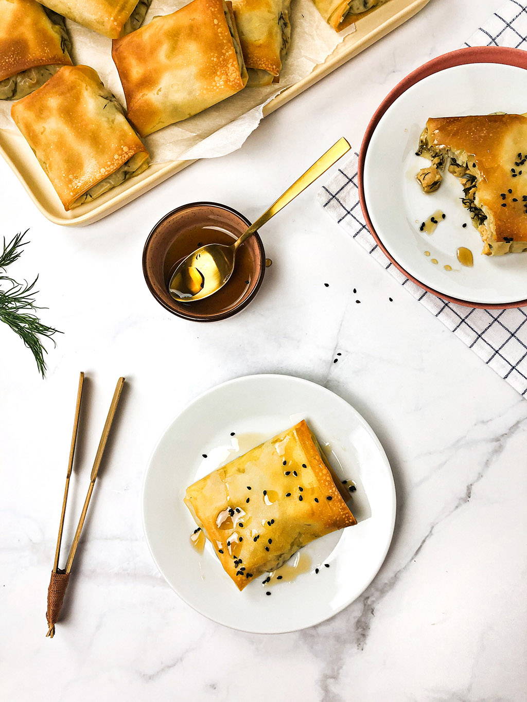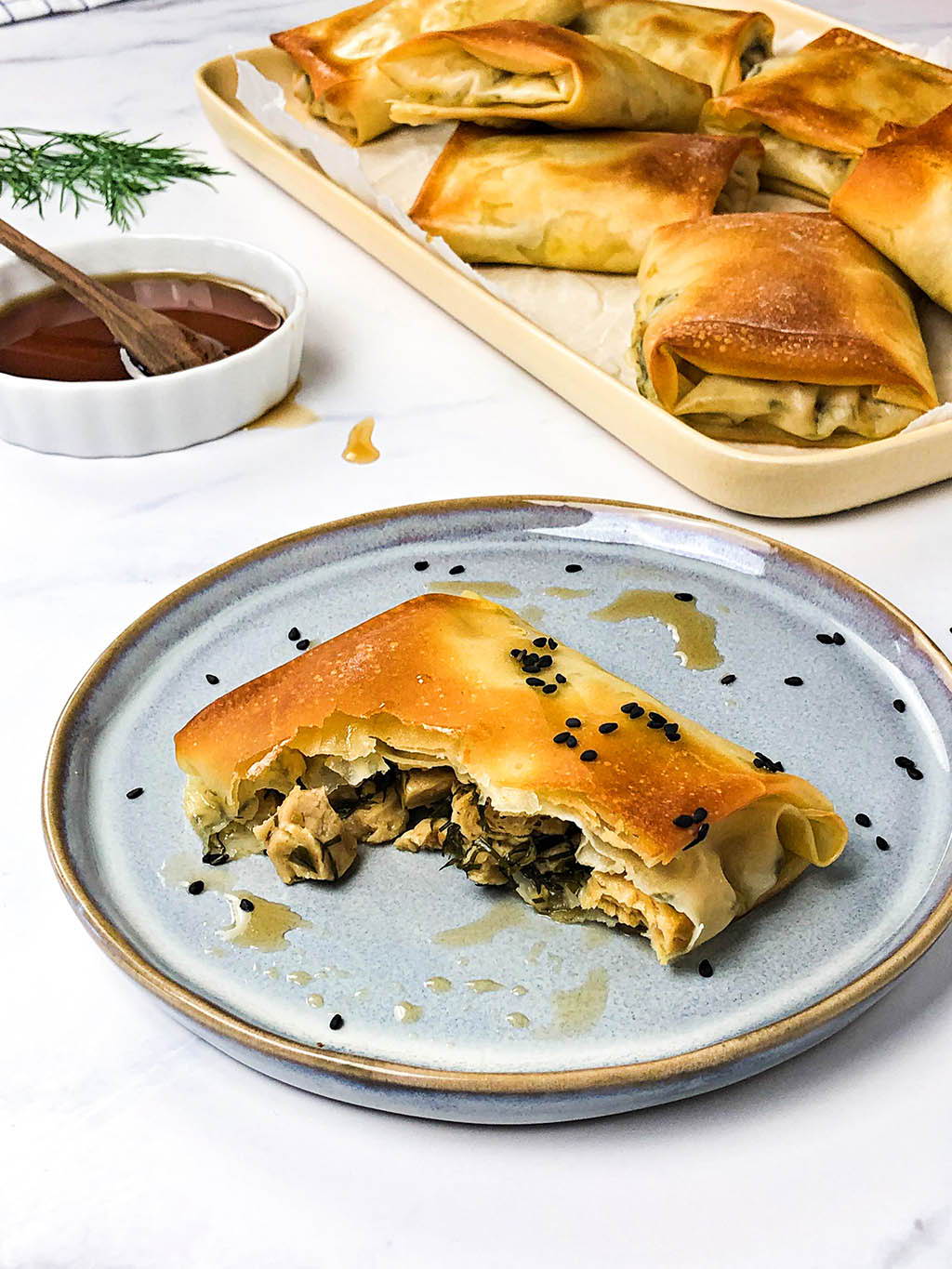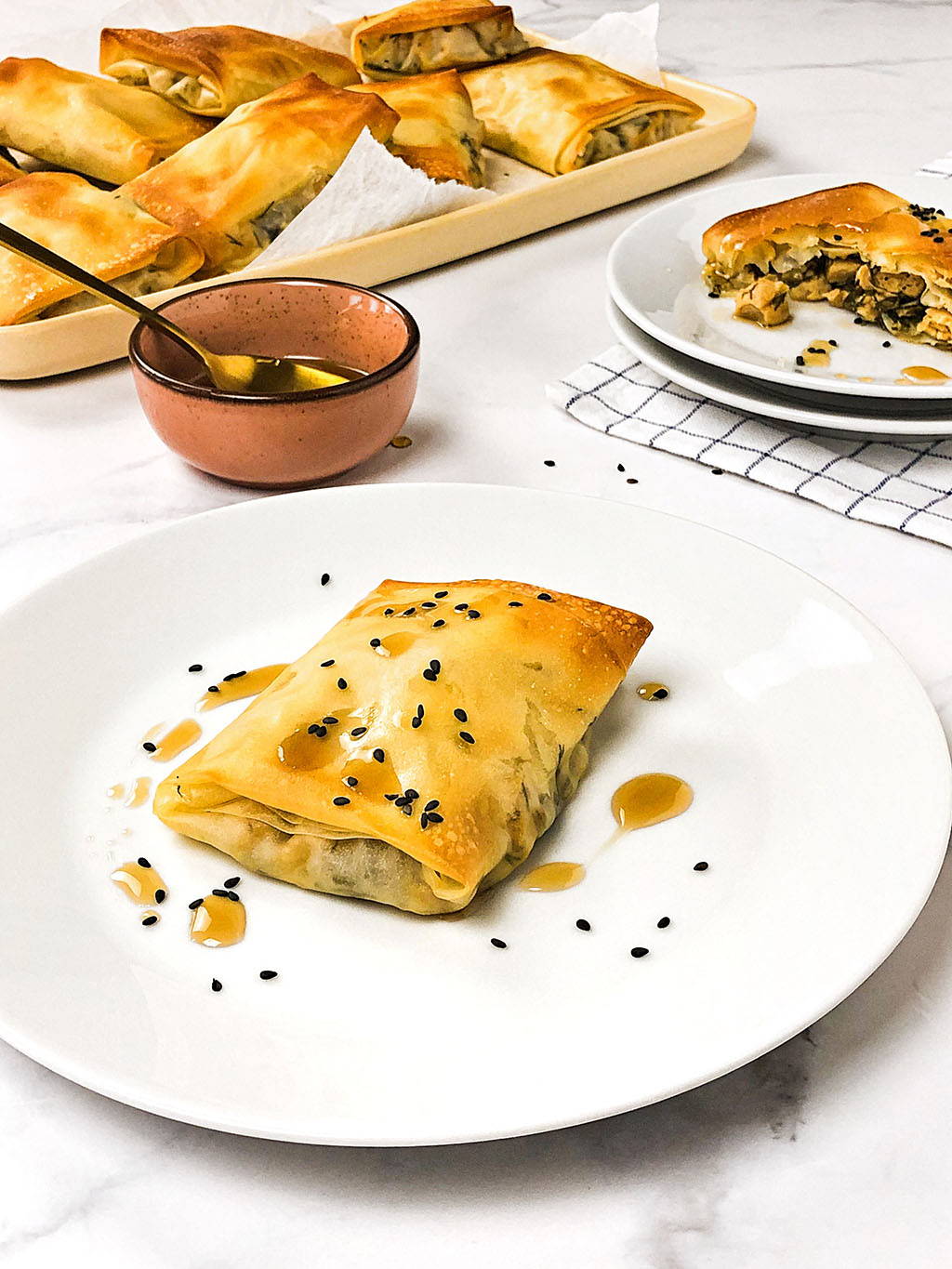 Dieser Filoteig Snack ist super knusprig, gefüllt mit einer köstlichen Mischung aus fleischigen Peas Maker Stücken, frischem Dill, Oregano, Petersilie und veganem Feta. Der perfekte vegane Snack für Partys, gesellige Abende oder als Vorspeise. Dieser Filoteig Snack ist auch noch ein einfaches Rezept und in nur 15 Minuten gemacht. Die Füllung kannst du problemlos einen Tag im Voraus vorbereiten. Wenn die Filoteig Snacks aus dem Ofen kommen, lassen wir sie zuerst 10 Minuten abkühlen, zumindest, wenn es uns gelingt, uns zurückzuhalten. 😊 Danach beträufeln wir sie noch mit Ahornsirup und bestreuen sie mit schwarzen Sesamsamen. Die Kombination aus salzig und süß ist für uns ein Traumpaar!