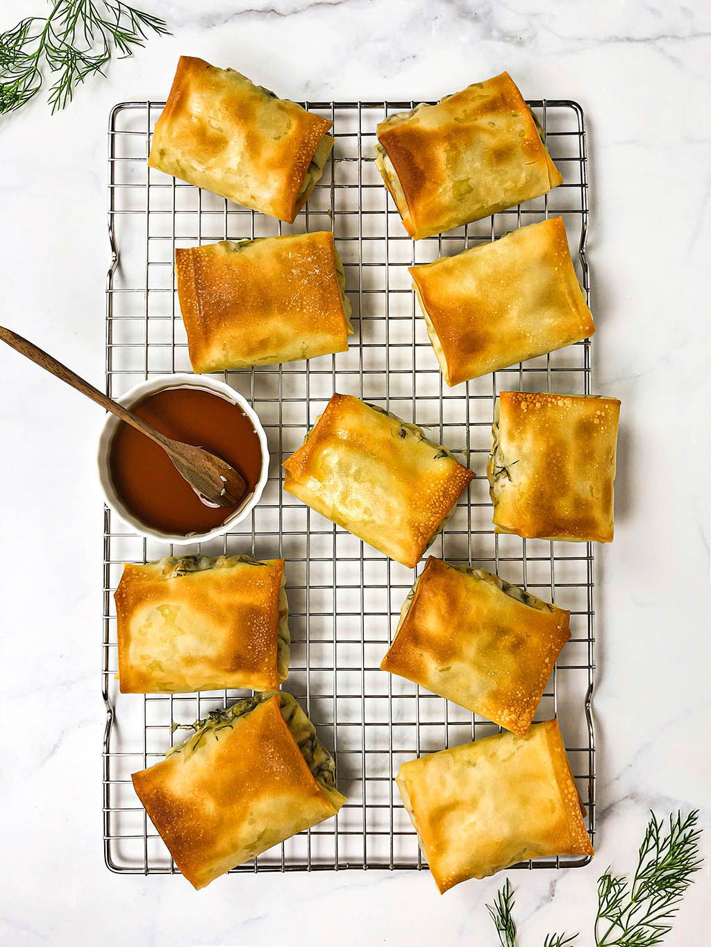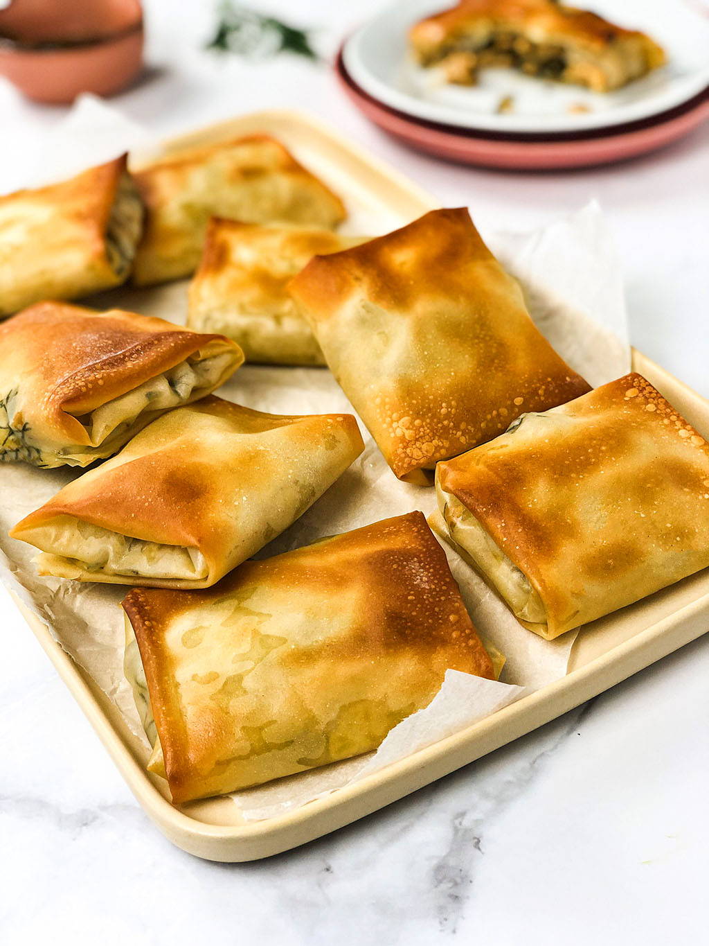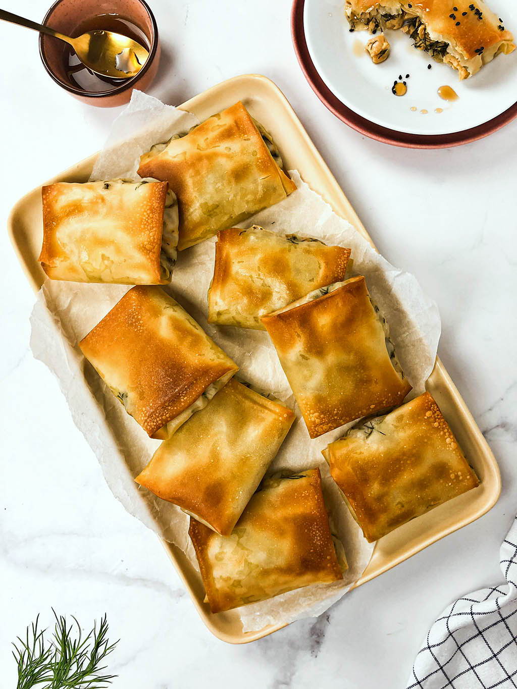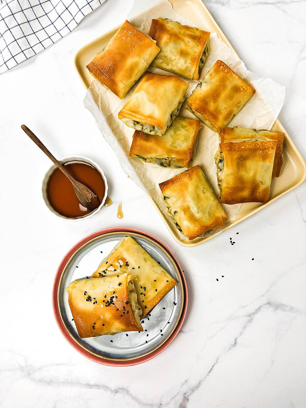 Dieser Filoteig Snack ist super knusprig, gefüllt mit einer köstlichen Mischung aus fleischigen Peas Maker Stücken, frischem Dill, Oregano, Petersilie und veganem Feta. Der perfekte vegane Snack für Partys, gesellige Abende oder als Vorspeise. Dieser Filoteig Snack ist auch noch ein einfaches Rezept und in nur 15 Minuten gemacht. Die Füllung kannst du problemlos einen Tag im Voraus vorbereiten. Wenn die Filoteig Snacks aus dem Ofen kommen, lassen wir sie zuerst 10 Minuten abkühlen, zumindest, wenn es uns gelingt, uns zurückzuhalten. 😊 Danach beträufeln wir sie noch mit Ahornsirup und bestreuen sie mit schwarzen Sesamsamen. Die Kombination aus salzig und süß ist für uns ein Traumpaar!