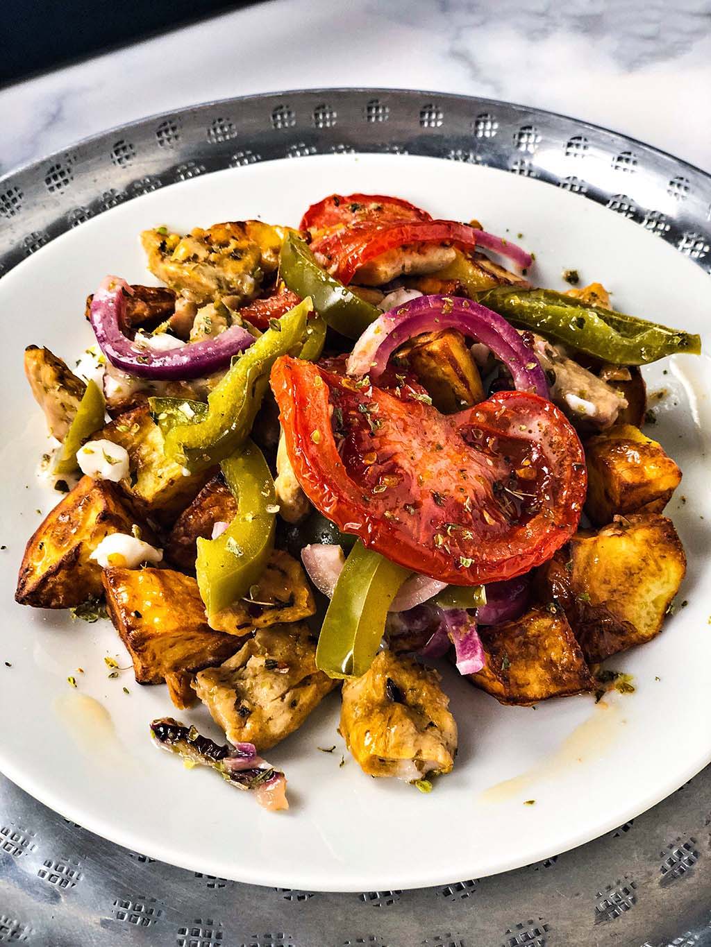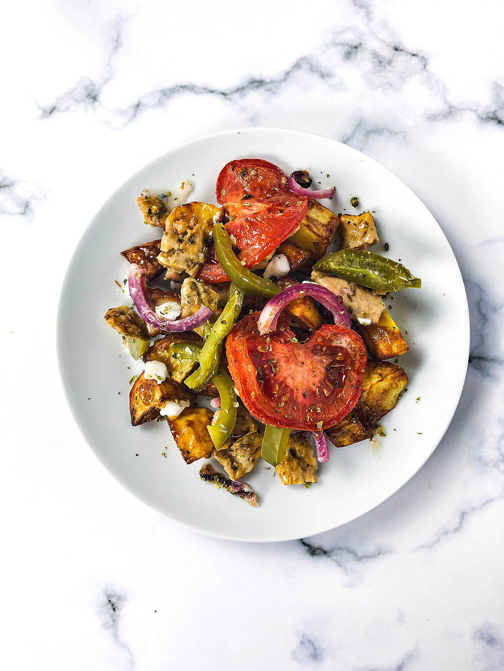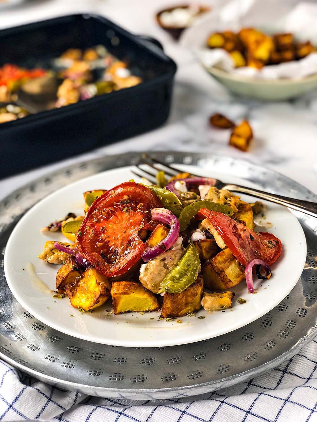 Wie du vielleicht gesehen hast, sind wir sehr vielfältig in unserer Küche. Abwechslung ist für uns ein absolutes Muss. Als wir noch nicht pflanzlich aßen, haben wir in Griechenland einmal Feta Bougiourdi gegessen. Dieses Gericht haben wir auf keinen Fall vergessen und wir sprechen immer noch regelmäßig darüber. Bei diesem Gericht wird Feta im Ofen mit Tomaten, Paprika, Zwiebeln, Olivenöl und Oregano gebacken. Die Kombination ist super lecker. Nicht nur der Feta wird dadurch weich, sondern auch die Tomaten, Paprika und Zwiebeln. Und der Duft und Geschmack des Oregano machen es besonders schmackhaft. Du kannst zum Beispiel dein Brot darin eintauchen oder den Auflauf mit Bratkartoffeln und Salat genießen.
