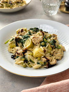 Während du in der Pfanne rührst, gib die trockenen Peas Maker Stücke (direkt aus der Verpackung) zusammen mit dem Wasser hinzu. Bringe alles zum Kochen. Sobald es kocht, deck die Pfanne ab und lass es 10 Minuten bei schwacher Hitze köcheln. Nimm den Deckel ab und rühre den Kokosjoghurt, das Garam Masala und das getrocknete Bockshornkleeblatt unter.