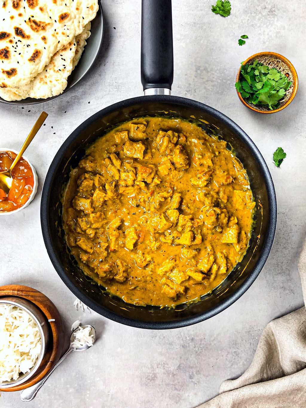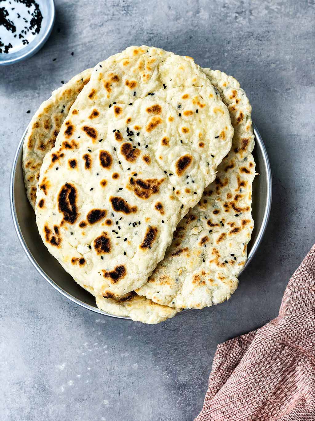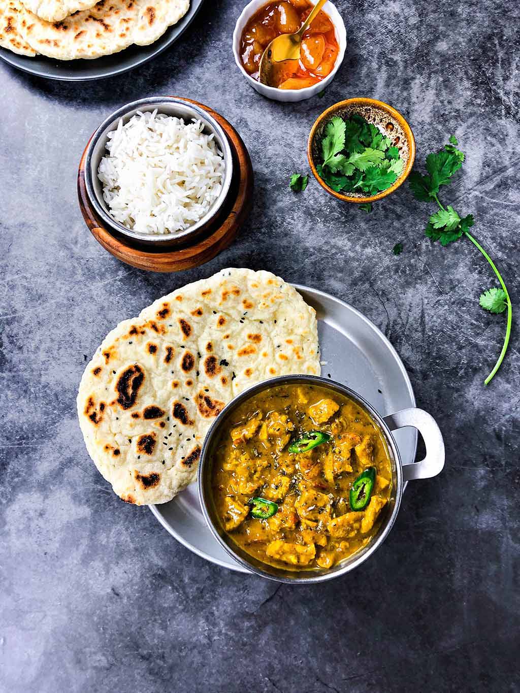 Ein sehr einfaches Rezept, das wir verwenden, um Naan-Brot zuzubereiten, teilen wir beim veganen Korma-Curry. Wir machen das Naan-Brot aus selbst aufgegangenem Mehl und dickem Kokosjoghurt. Du kannst optional etwas Schwarzkümmel und Salz hinzufügen. Du kannst das Naan-Brot auch problemlos einfrieren, sodass du immer etwas zur Hand hast, um es zu deinem Currygericht zu servieren.