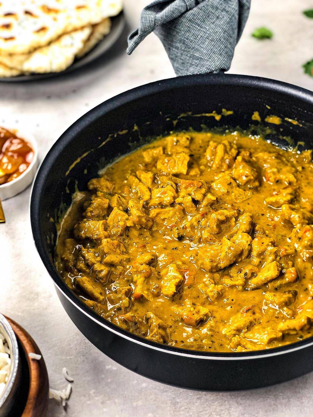 Ein gutes Curry besteht normalerweise aus einer langen Liste von Zutaten, aber bei diesem Curry ist das Glücklicherweise nicht der Fall. Es ist wahrscheinlich, dass du die meisten Zutaten bereits in deinem Vorratsschrank hast. Außerdem wird dieses Curry in einer Pfanne zubereitet. Ganz einfach! Serviere es mit Basmatireis und Naan-Brot, und dein Abend kann nicht mehr schiefgehen.