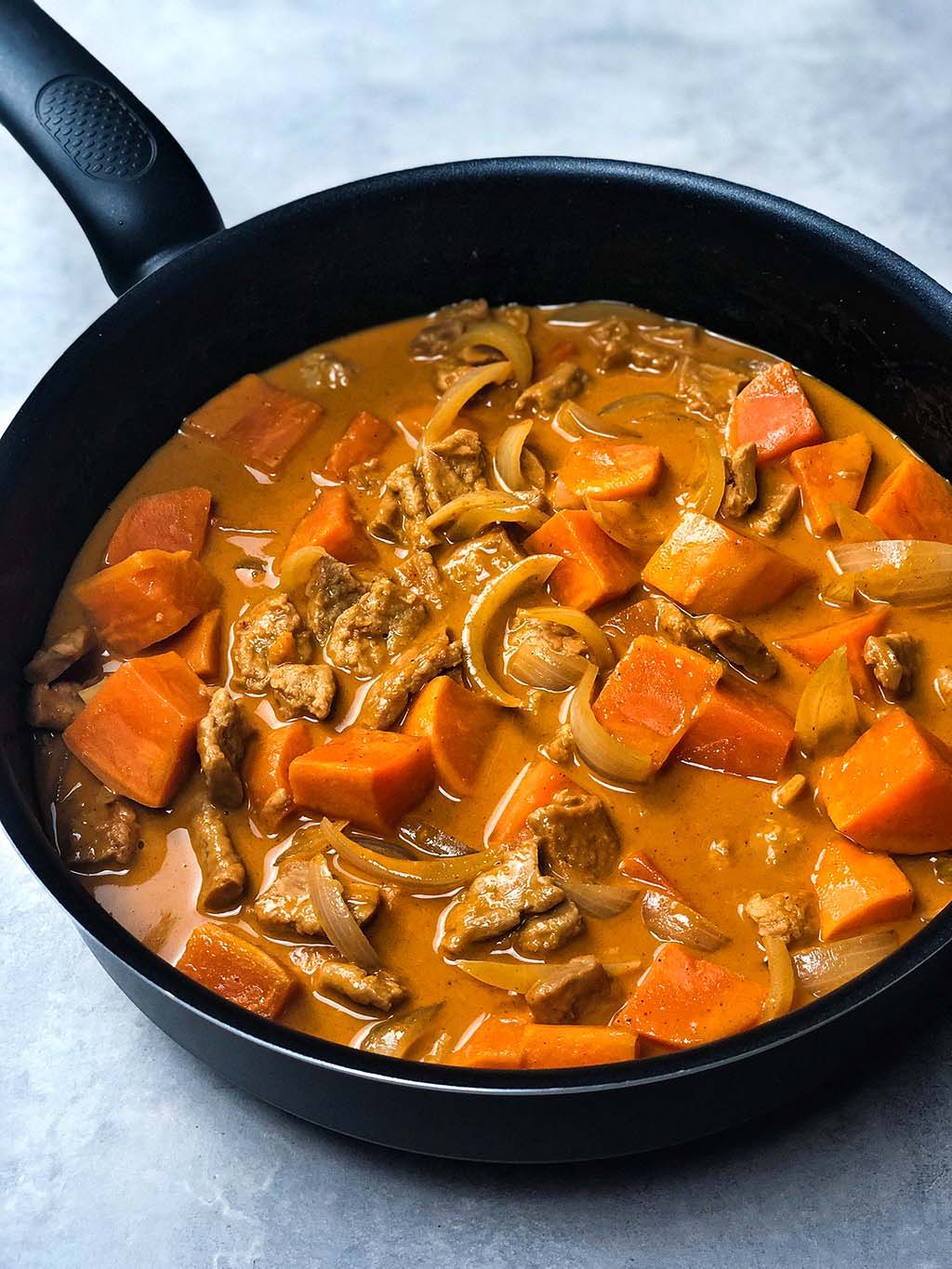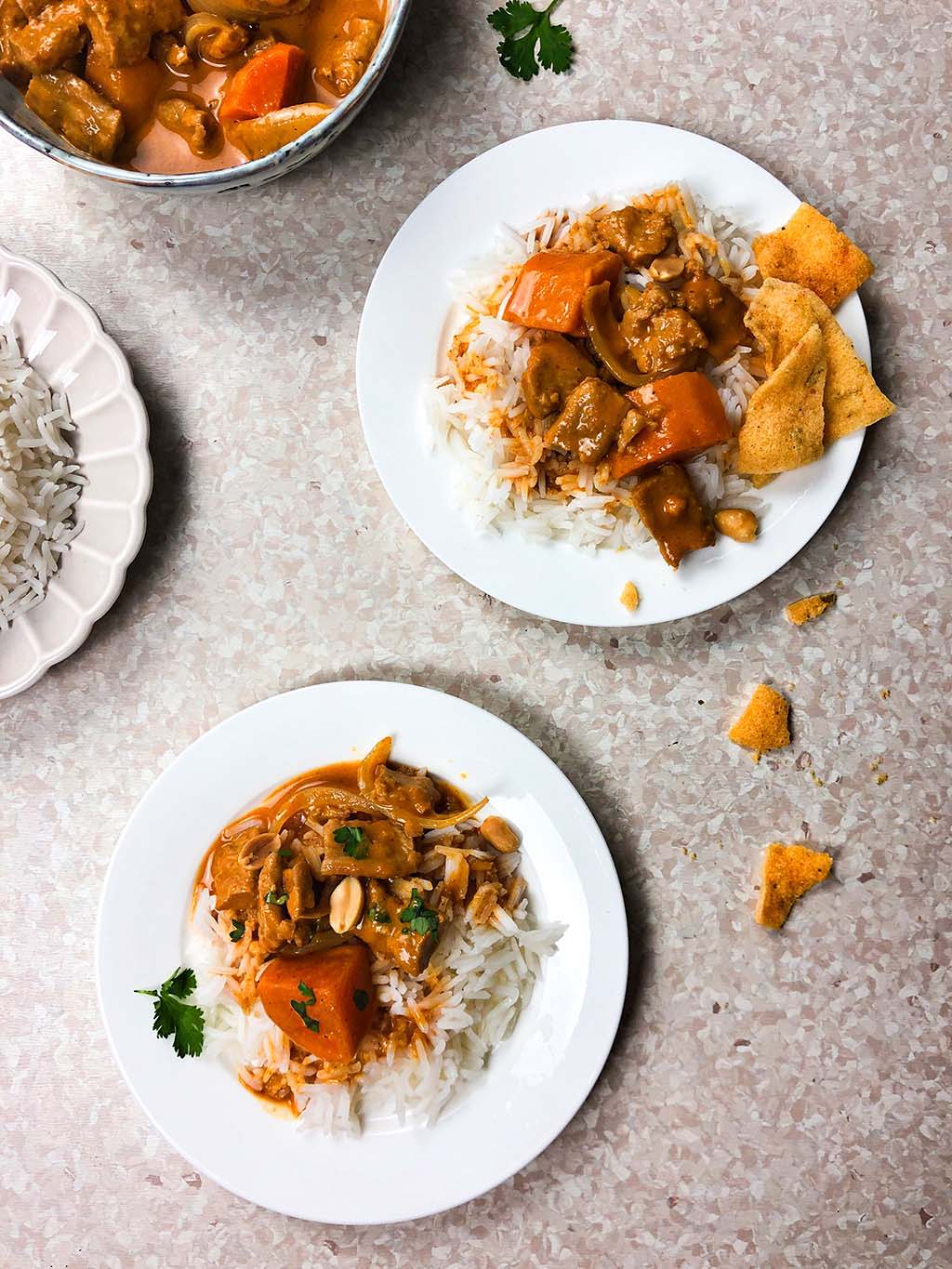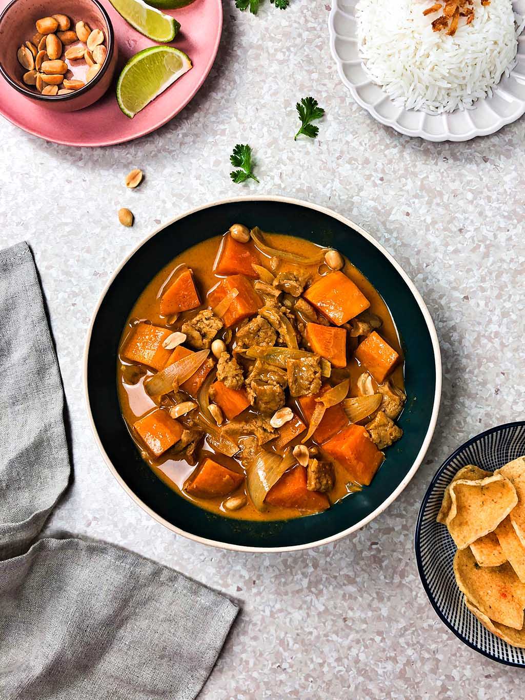 Hier siehst du wieder, obwohl es sich um ein thailändisches Curry handelt, dass dieses Curry aus Einflüssen von außerhalb entstanden ist. Das finden wir immer interessant an Gerichten. Normalerweise wird dieses Curry mit Fleisch zubereitet, aber wir teilen gerne eine köstliche vegane Version mit dir.