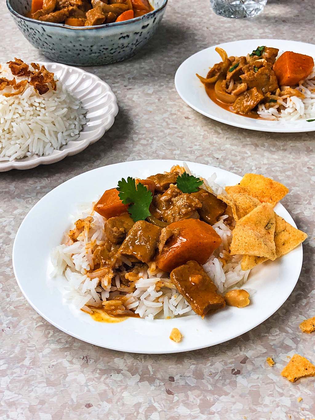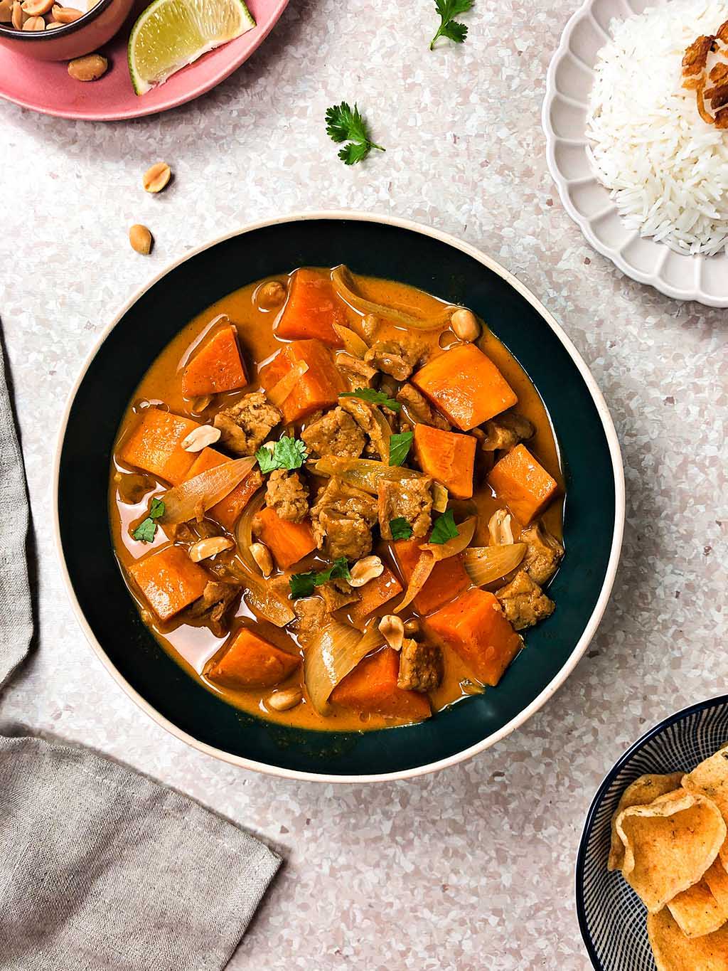Ist das vegane Rendang dein großer Favorit? Dann sind wir uns ziemlich sicher, dass dieses Rezept ein neuer Liebling werden wird. Nach einigen Versuchen haben wir ein super einfaches Rezept entwickelt, das unglaublich lecker schmeckt. Als ob du stundenlang in der Küche gestanden wärst. Und, hier ist schon ein kleines Geheimnis: Du kannst es in nur 25 Minuten mit nur 7 Zutaten zubereiten. Ja, wirklich, das geht! Wir essen dieses Massaman Curry gerne mit Basmatireis und Maniok Chips. Außerdem garnieren wir es mit etwas Limettensaft, frischem Koriander und gerösteten Erdnüssen. Ein Gericht aus aller Welt, das du unbedingt probieren solltest.