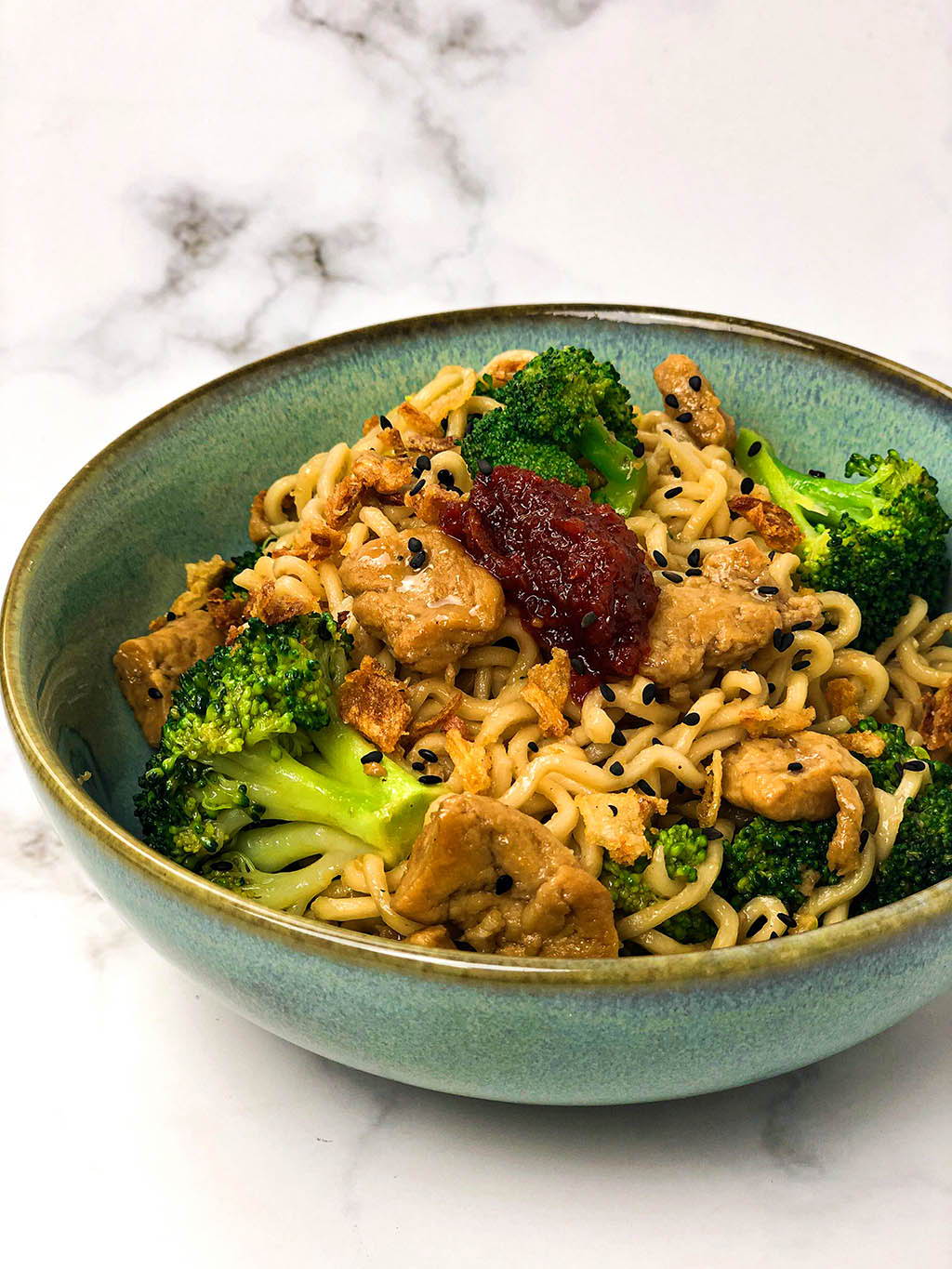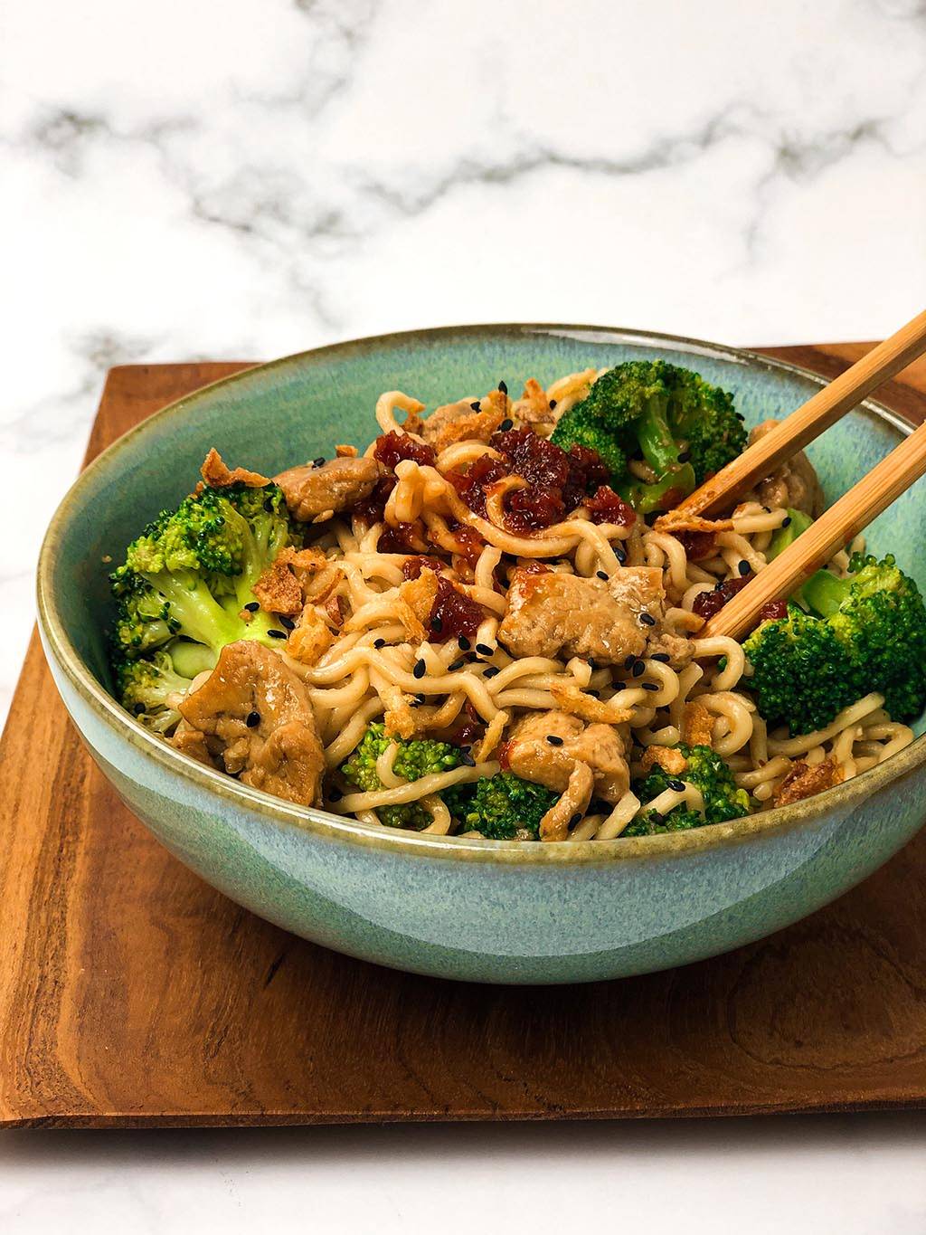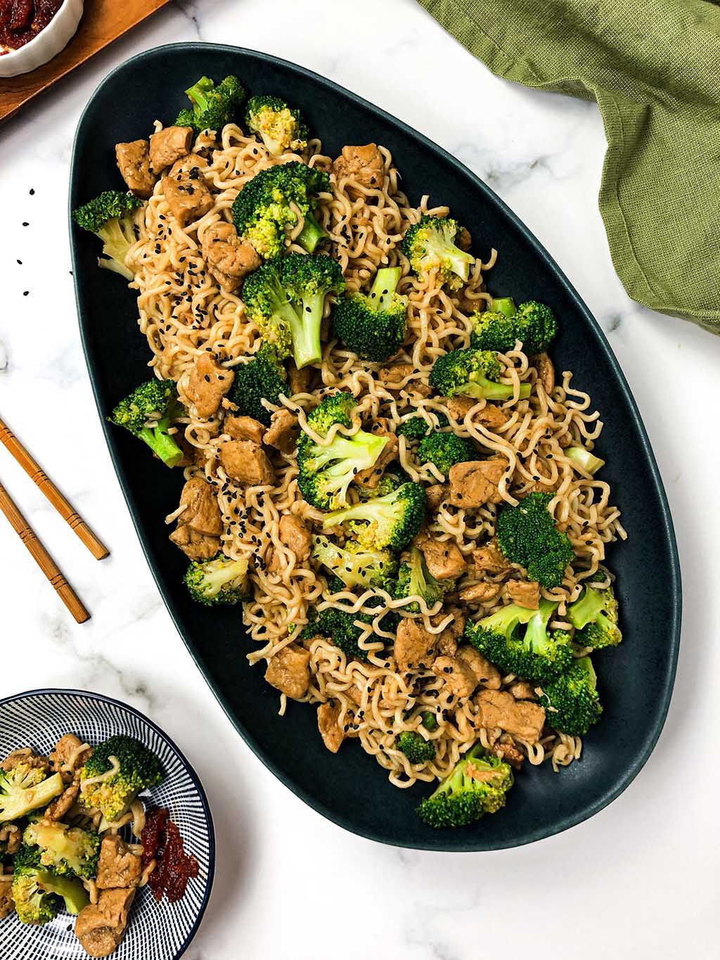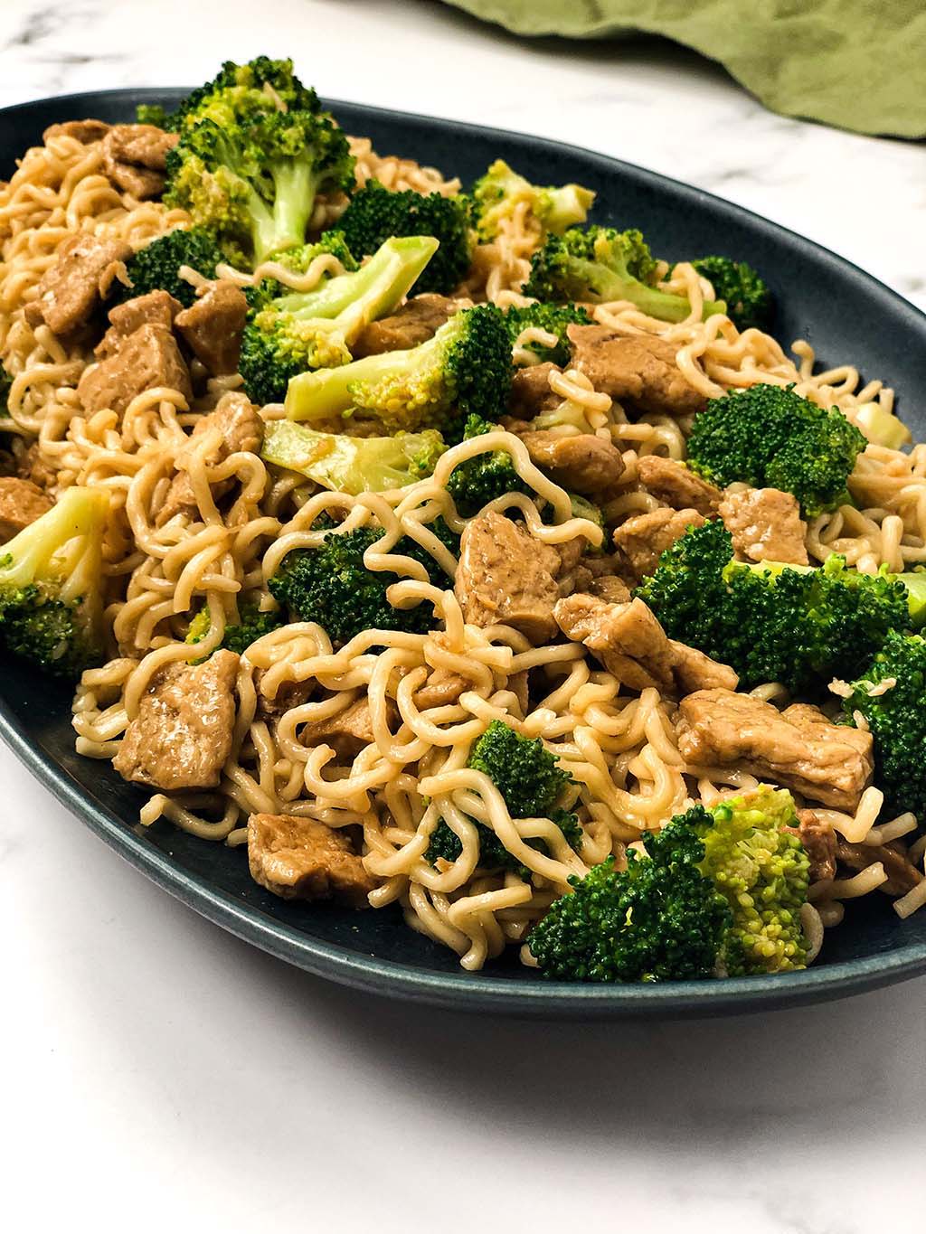 Die Sauce in diesem Gericht spielt wirklich die Hauptrolle, denn sie ist außergewöhnlich lecker! Die Kombination aus Sojasauce, braunem Zucker, Sesamöl, Knoblauch und frischem Ingwer macht dieses Gericht so besonders. Diese Geschmacksgeber marinieren nicht nur die Peas Maker Stücke, sondern umhüllen auch die Nudeln und den Brokkoli. Jeder Bissen ist daher eine Geschmacksexplosion in deinem Mund. Und dieses Gericht ist in nur 25 Minuten zubereitet!