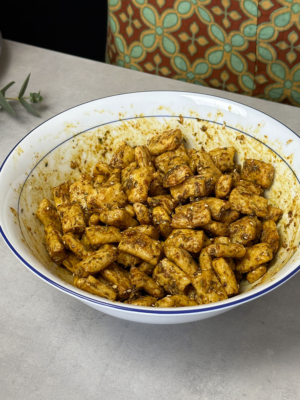 Mische in einer Schüssel Olivenöl, Granatapfelmelasse, Ras el Hanout, Za'atar und Salz. Die Peas Maker Stücke dazugeben und gut vermengen, sodass alle Stücke mit der Marinade bedeckt sind. Zur Seite stellen oder für später im Kühlschrank aufbewahren.