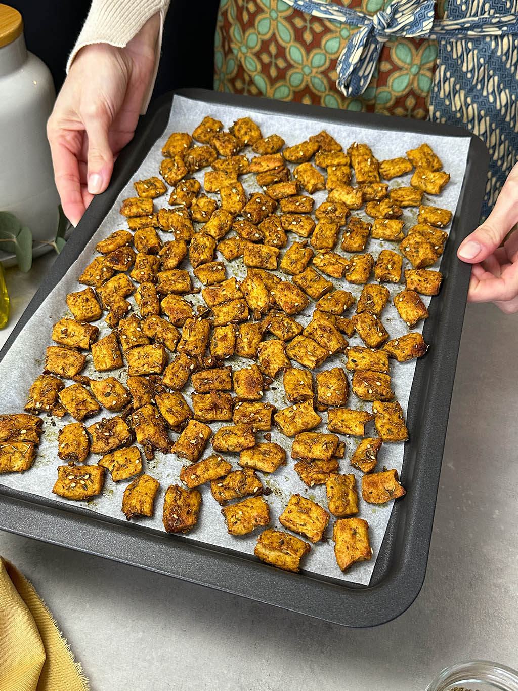 Ein Backblech mit Backpapier auslegen und die marinierten Peas Maker Stücke gleichmäßig auf dem Backblech verteilen. 10–15 Minuten im Ofen backen.