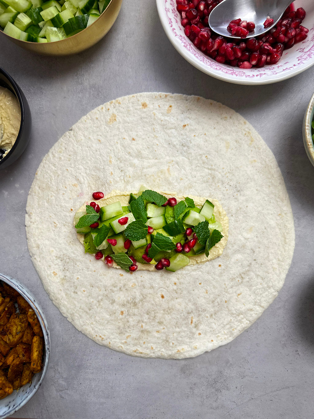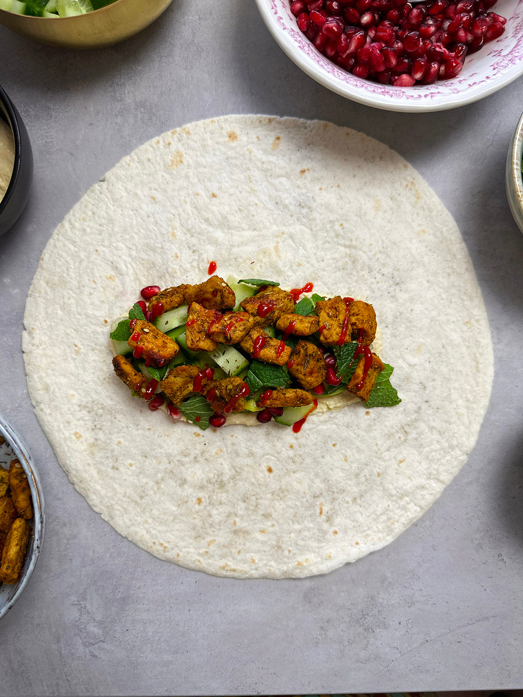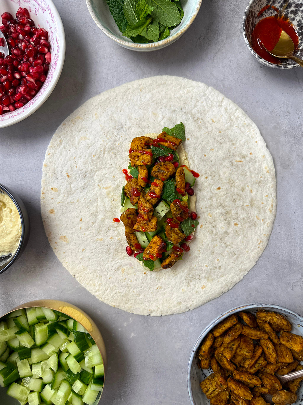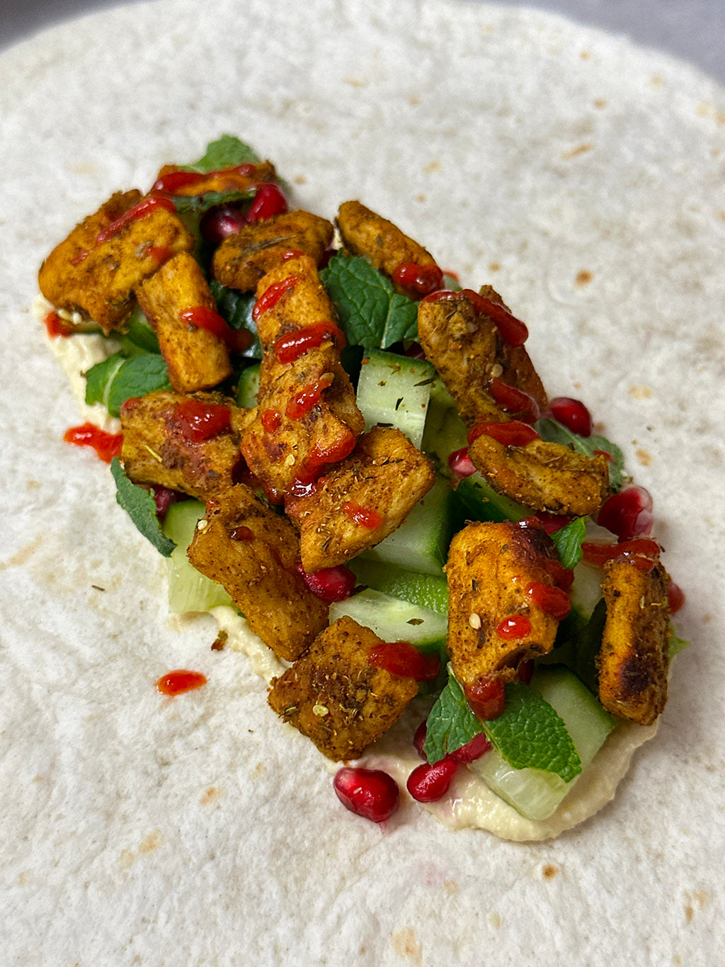 In der Zwischenzeit die Gurke in kleine Würfel schneiden. Bestreiche die Mitte eines Tortilla Wraps mit Hummus. Einige Avocadoscheiben, Gurkenwürfel, Granatapfelkerne und Minzblätter darüber verteilen. Gib einige gebackene Peas Maker Stücke dazu und garniere es mit Sriracha Sauce.