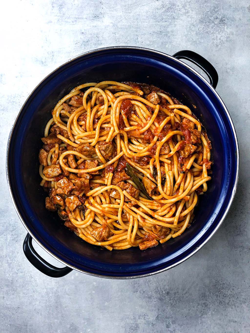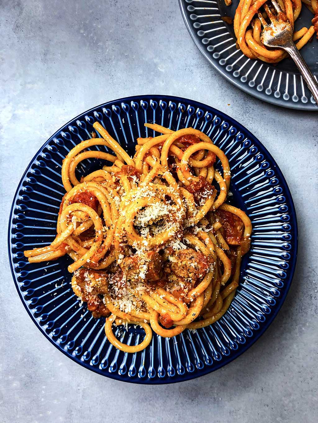 Natürlich kannst du jede Art von Pasta wählen, die dir schmeckt. Hier gibt es keine festen Regeln, soweit wir wissen. Aber wenn wir unsere Vorlieben teilen dürfen, würden wir bei diesem Gericht die Bucatini-Nudeln wählen. Diese Nudeln ähneln Spaghetti, sind aber etwas dicker. Sie passen perfekt zu diesem veganen Ragu und sind auch eine Abwechslung zu "normalen" Spaghetti. Wenn du keine Bucatini finden kannst, entscheidedich einfach für Spaghetti!