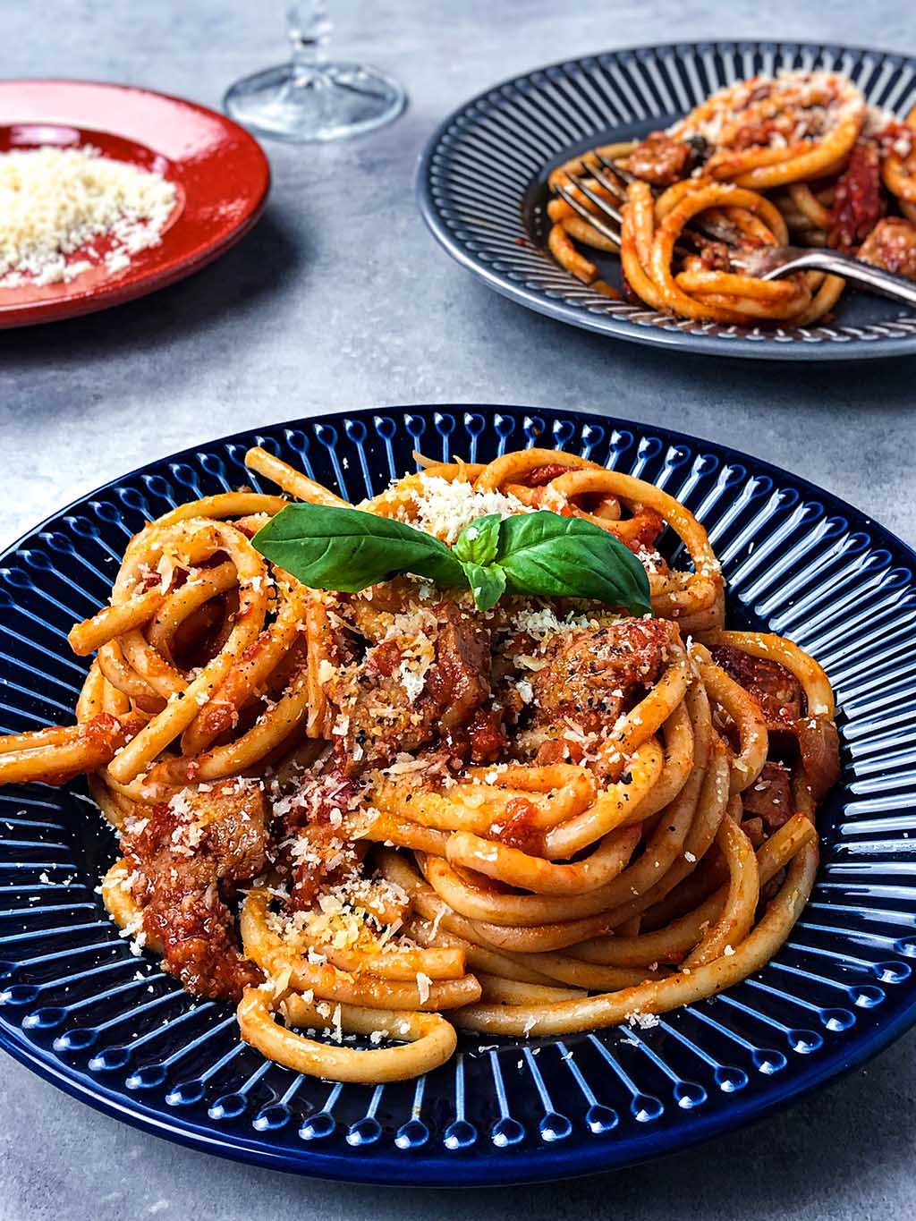 In diesem Gericht haben wir Bucatini-Nudeln verwendet. Diese dicken Stränge passen perfekt zu diesem veganen Ragu. Wir servieren es dann gerne mit etwas geriebenem veganen Parmesan, einem Schuss Olivenöl und frischem Basilikum. Buon appetito!