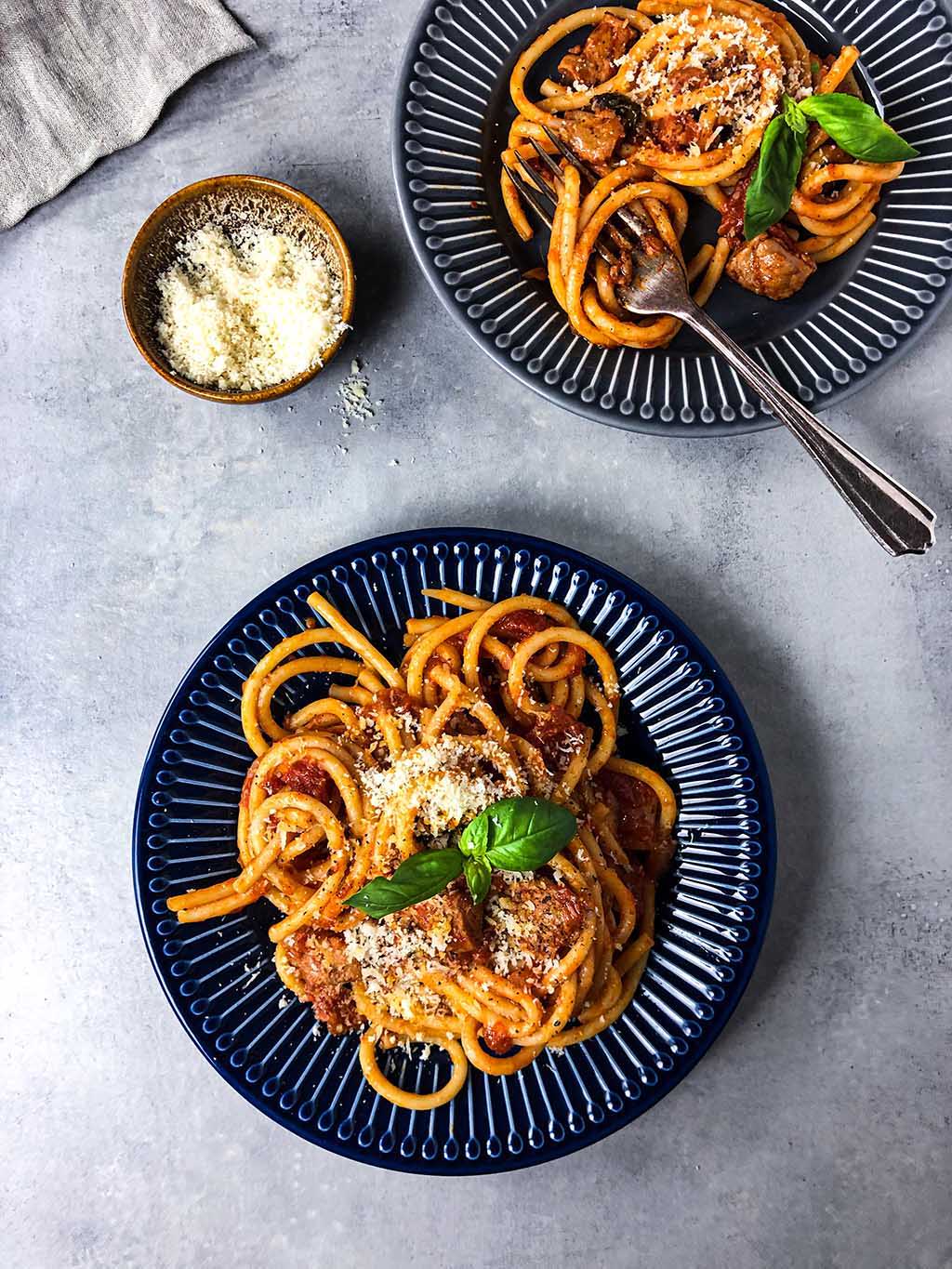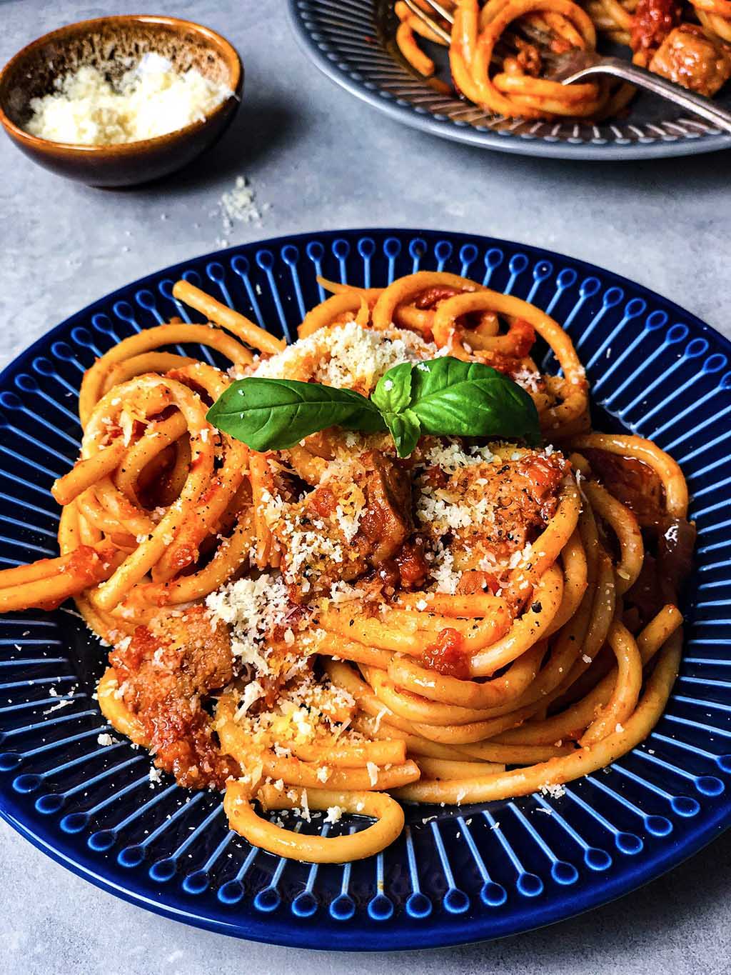 Gleichzeitig kochen wir die Bucatini-Nudeln gemäß den Anweisungen auf der Verpackung. Die Nudeln sollten al dente sein, da sie später noch in der Soße nachgaren. Sobald die Pasta fertig ist, fügen wir sie der Soße hinzu. Dann vermengen wir alles gut, damit jede Nudelschnur von der Soße bedeckt ist. Anschließend nehmen wir die Pfanne vom Herd und lassen alles noch ein paar Minuten mit Deckel ruhen. So können sich die Sauce und die Aromen gut in den Nudeln entfalten. Wir garnieren das Pasta Ragu mit etwas geriebenem veganem Parmesan, extra nativem Olivenöl und frischem Basilikum.