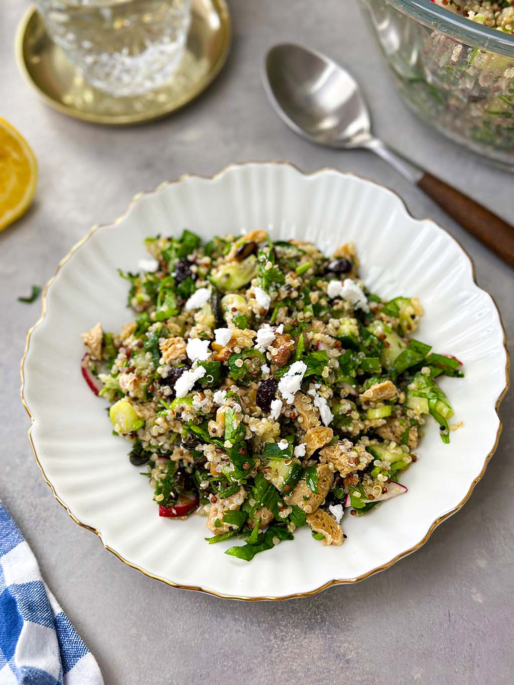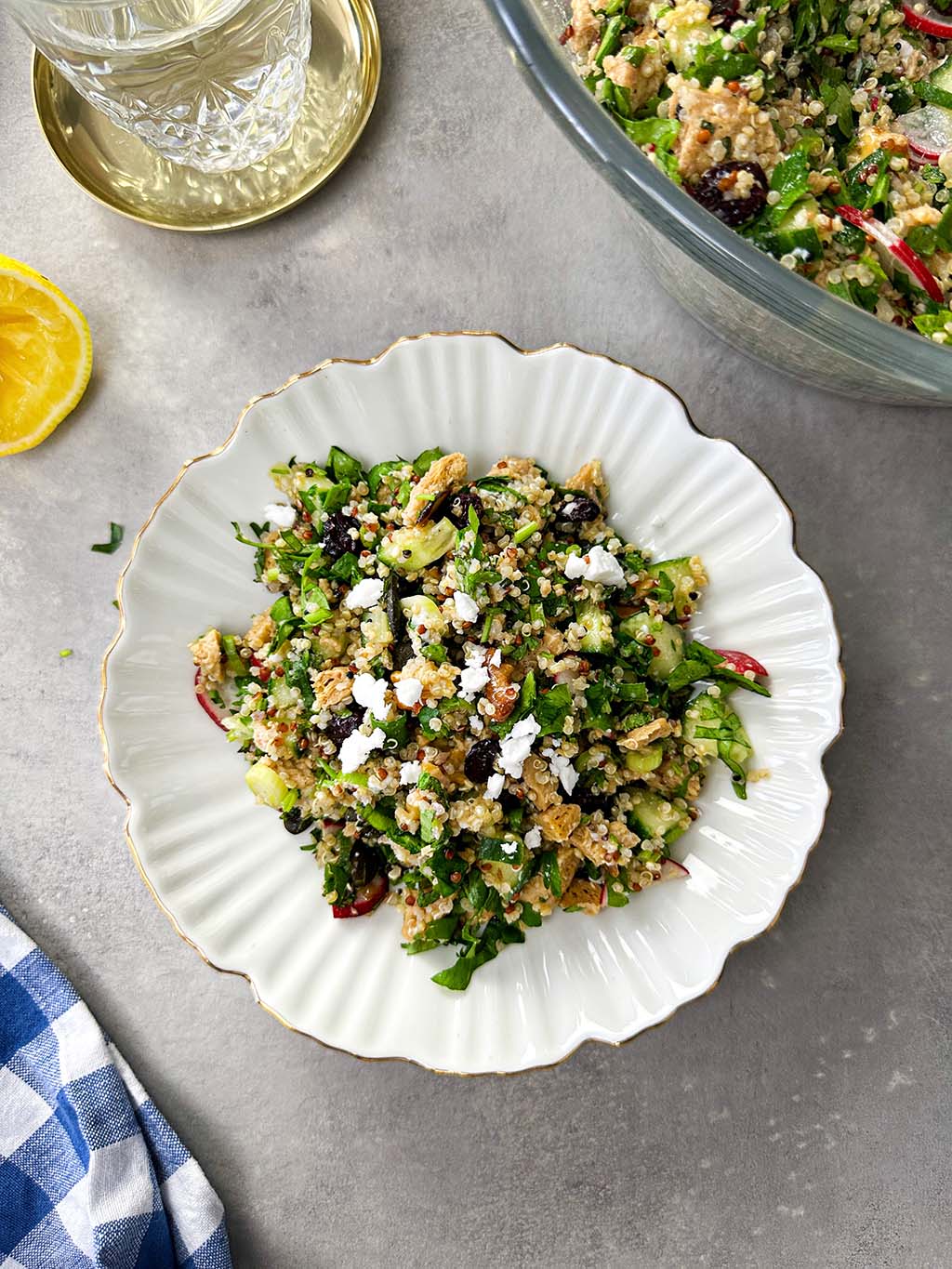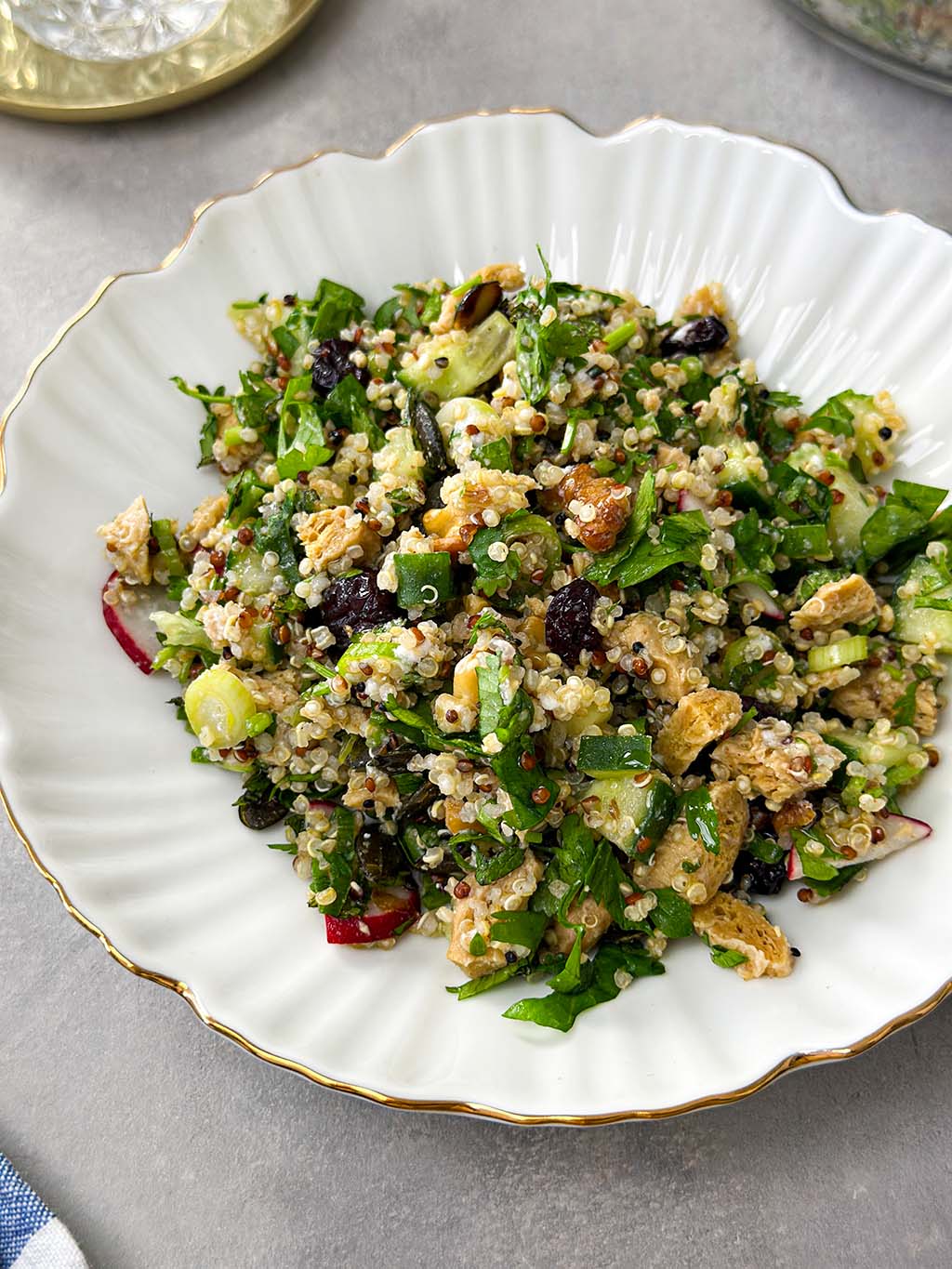 Für den Salat: Koche in der Zwischenzeit den Quinoa gemäß den Anweisungen auf der Verpackung und lasse ihn dann abkühlen, bis er lauwarm ist. Gib ihn in eine Schüssel. Schneide die Gurke in Würfel, die Radieschen in dünne Halbscheiben und die Frühlingszwiebeln in dünne Ringe. Hacke die Walnüsse grob und hacke die Petersilie, den Koriander und die Minzblätter fein. Füge alles zusammen mit den getrockneten Cranberries und den gerösteten Kürbiskernen der Schüssel mit Quinoa hinzu. Vermenge alles gut und zerbröckle dann den veganen Feta in der Schüssel.