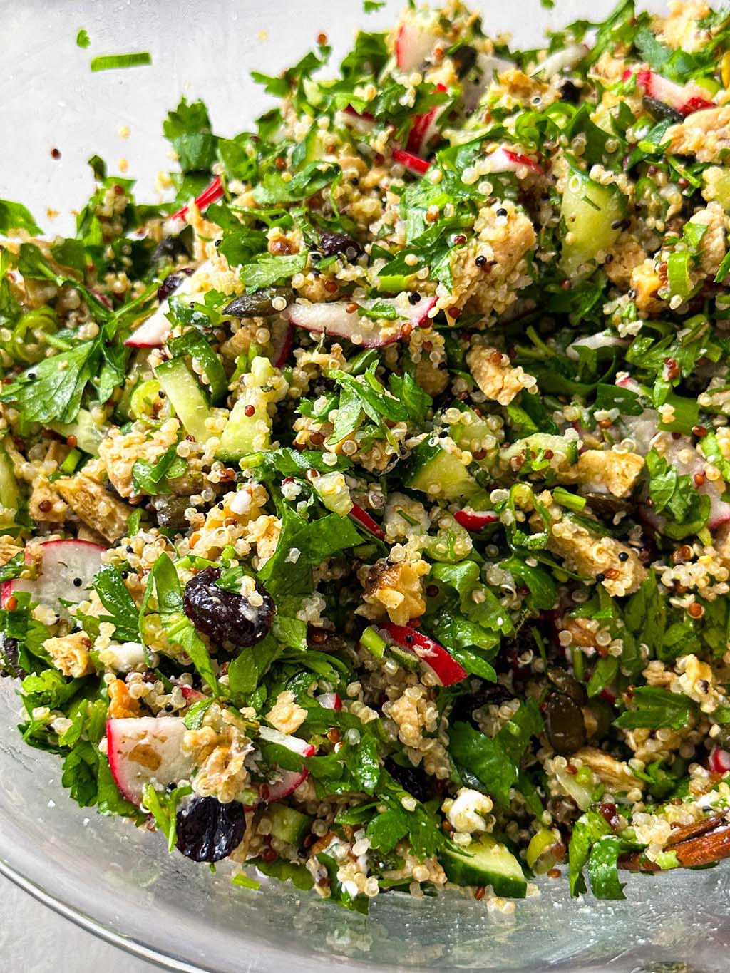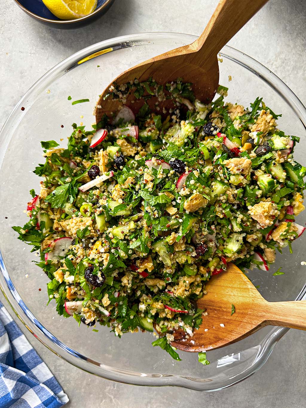 Als nächstes kochen wir den Quinoa nach den Anweisungen auf der Verpackung. Diesen geben wir dann in eine Schüssel zusammen mit den gewürfelten Gurken, den dünnen Radieschenscheiben und den geschnittenen Frühlingszwiebeln. Hier fügen wir auch die getrockneten Cranberries, gehackten Walnüsse, frische Petersilie, frischen Koriander, Minzblätter, geröstete Kürbiskerne und zerbröckelten veganen Feta hinzu, zusammen mit den gewürzten Peas Maker Stücken. Das alles vermengen wir gut.