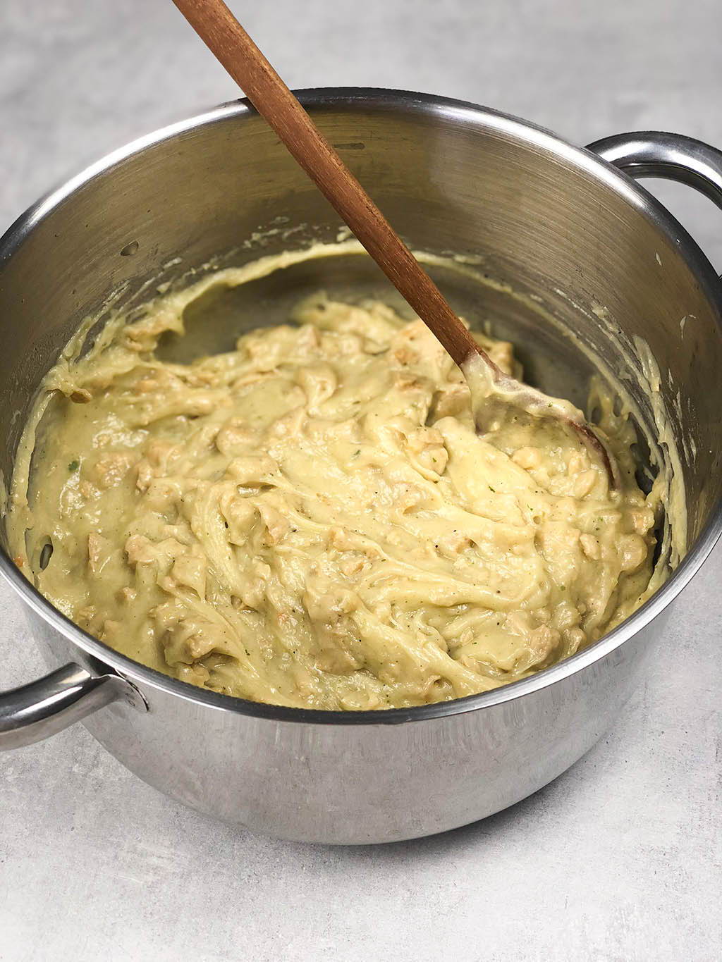 Dann bereiten wir eine einfache Mehlschwitze zu, indem wir pflanzliche Butter in einer Pfanne schmelzen und dann Mehl hinzufügen. Während wir in der Pfanne mit einem Schneebesen rühren, fügen wir langsam die Gemüsebrühe hinzu. Dadurch entsteht eine cremige Masse. Dann würzen wir sie mit Salz und frisch gemahlenem schwarzen Pfeffer. Anschließend fügen wir die Peas Maker Stücke hinzu. Dies lassen wir in einer flachen Schüssel abkühlen. Dann lassen wir sie im Kühlschrank gut fest werden.