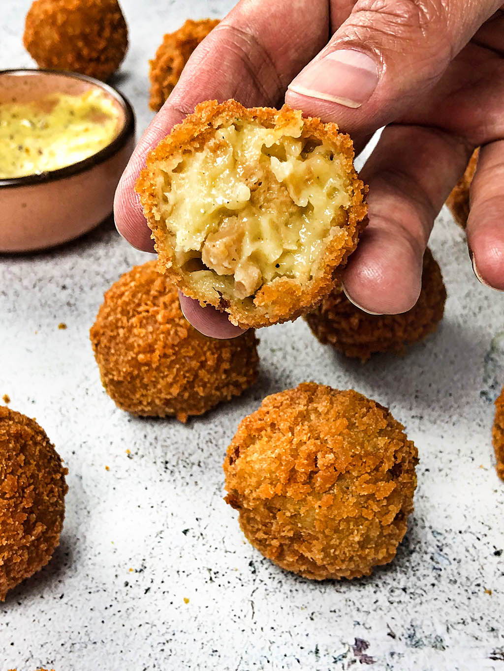 Vegane Bitterballen gehören einfach zu jeder Party, zu einem Aperitif oder Geburtstag. Dieser typisch holländische Snack ist etwas, das wir unbedingt ausprobieren mussten. Und, oh Mann, es ist wirklich lecker geworden. Diese veganen Bitterballen sind außen super knusprig und innen weich und cremig. Darüber hinaus haben sie eine wunderbare Textur durch die Peas Maker Stücke. Ehrlich gesagt, es ist, als würde man Van Dobben Bitterballen essen.