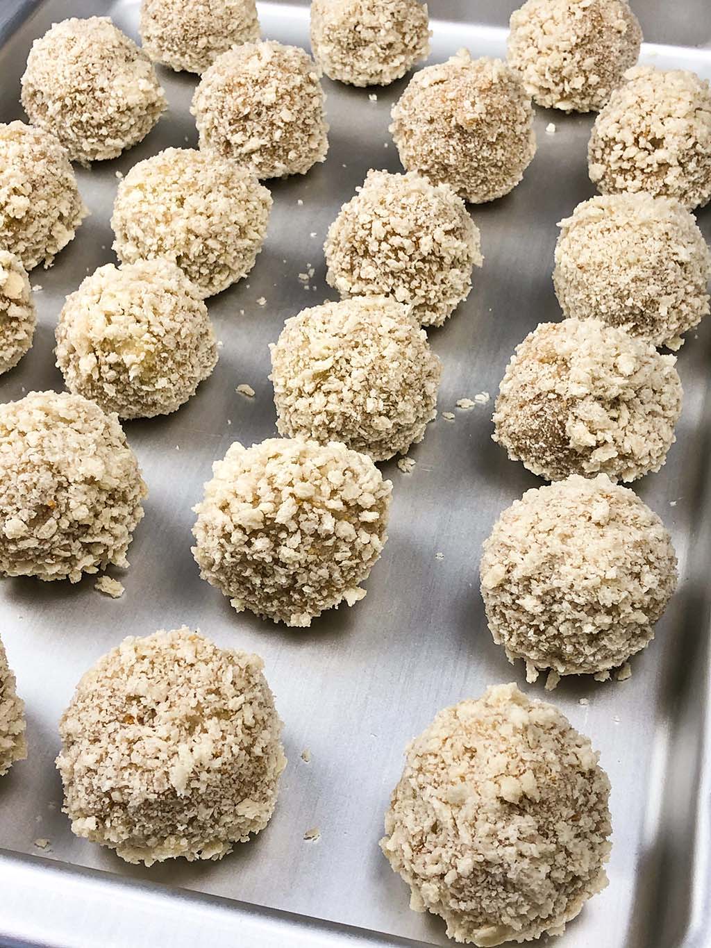 Stelle jetzt eine Schüssel mit Wasser, einen Teller mit Paniermehl und einen Teller mit Panko bereit. Rolle jeden Ball zuerst im Paniermehl, dann im Wasser, wieder im Paniermehl, dann wieder im Wasser und zuletzt im Panko. (Zusammengefasst: Paniermehl - Wasser - Paniermehl - Wasser - Panko.)