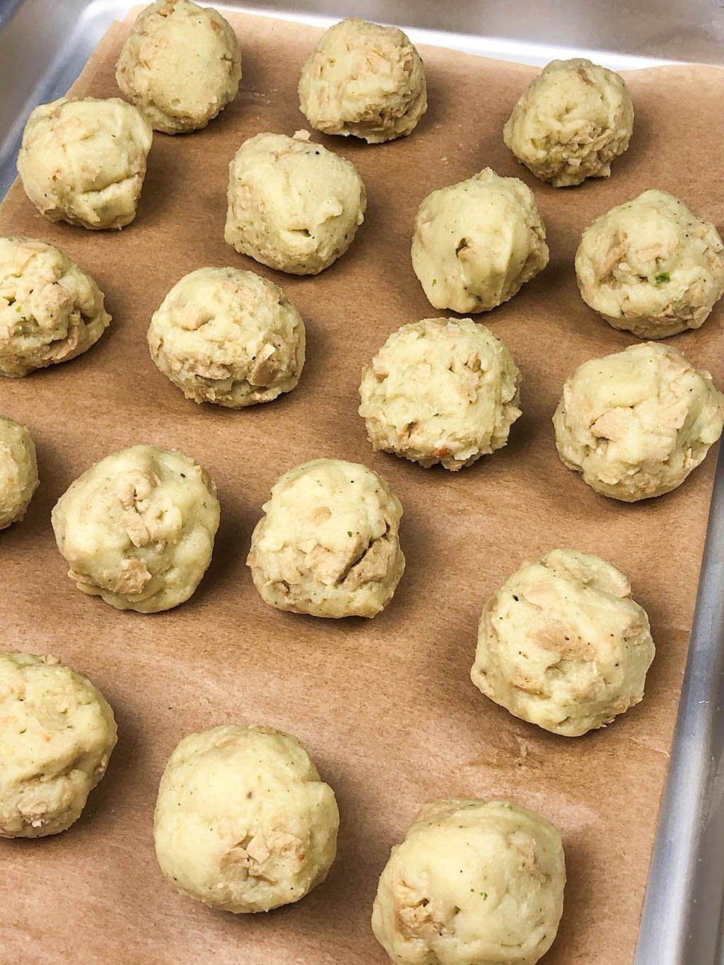• Wenn du Bällchen aus der Füllung formst, achte darauf, dass sie außen so glatt wie möglich sind. Also, sorge dafür, dass so wenig wie möglich Risse und herausragende Stücke vorhanden sind.