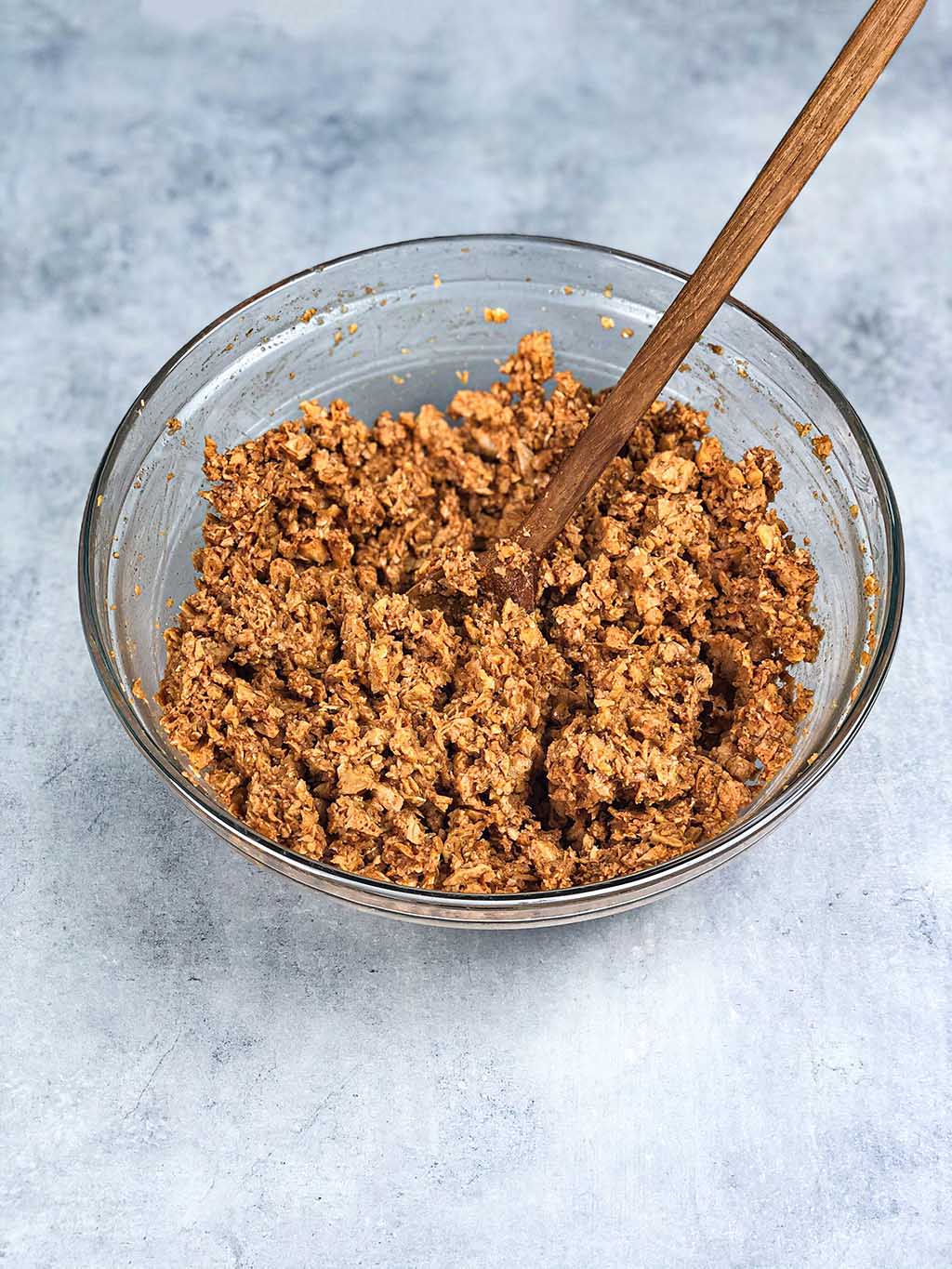 Um diesen Burger vegan zu machen, benötigst du nur wenige Zutaten. Aber wie gibst du einem veganen Burger auf pflanzliche Weise eine leckere Textur? Wir verwenden dafür die Peas Maker Stücke in diesem Rezept. Zuerst weichen wir die Peas Maker Stücke in kochendem Wasser ein. Dann hacken wir sie vollständig fein. Oder du kannst die Stücke auch in einer Küchenmaschine vollständig zerkleinern. Genauso einfach. Gib alles wieder in eine Schüssel. Dann würzen wir es mit Salz, Apfelessig, Zwiebelpulver, Knoblauchpulver, Paprikapulver, Ahornsirup, schwarzem Pfeffer, Hefeflocken, Tomatenmark und Haferflocken. Wir fügen auch etwas Wasser hinzu, um die Mischung gut zusammenzubringen. Rühre alles kräftig durch, damit es eine homogene Masse wird.