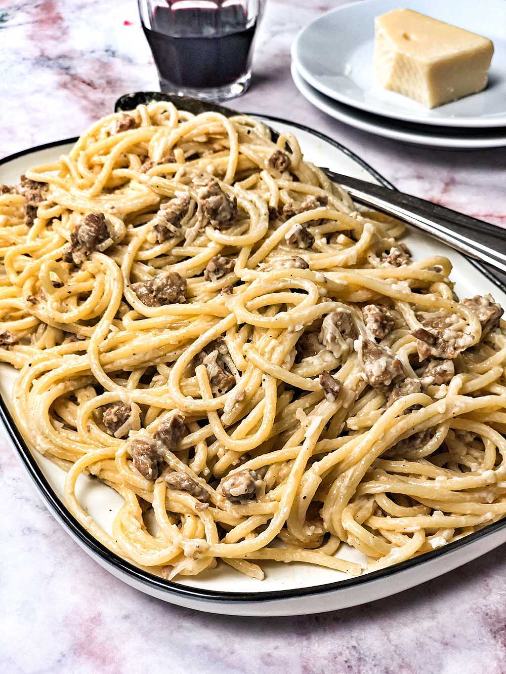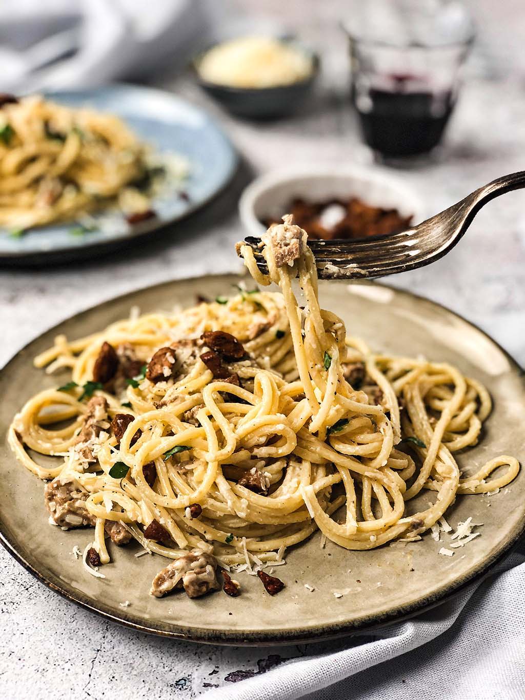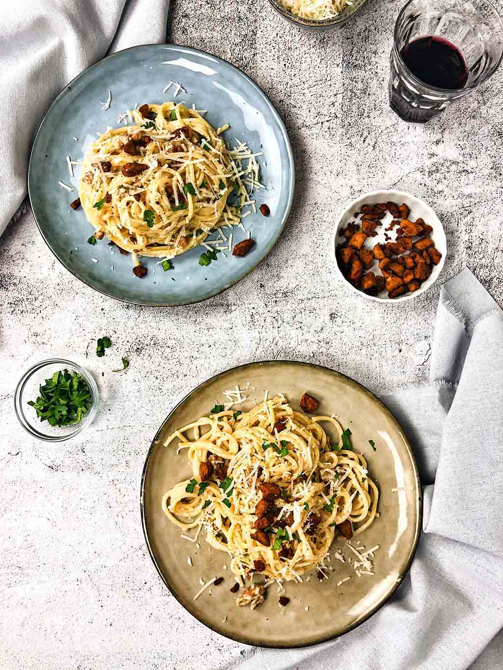 Jedes Mal, wenn wir dieses Gericht für Freunde und Familie zubereitet haben, wurde sofort nach dem Rezept gefragt. Niemand konnte glauben, dass es vegan war. Deshalb ist es höchste Zeit, dass wir dieses vegane Carbonara-Rezept mit dir teilen.