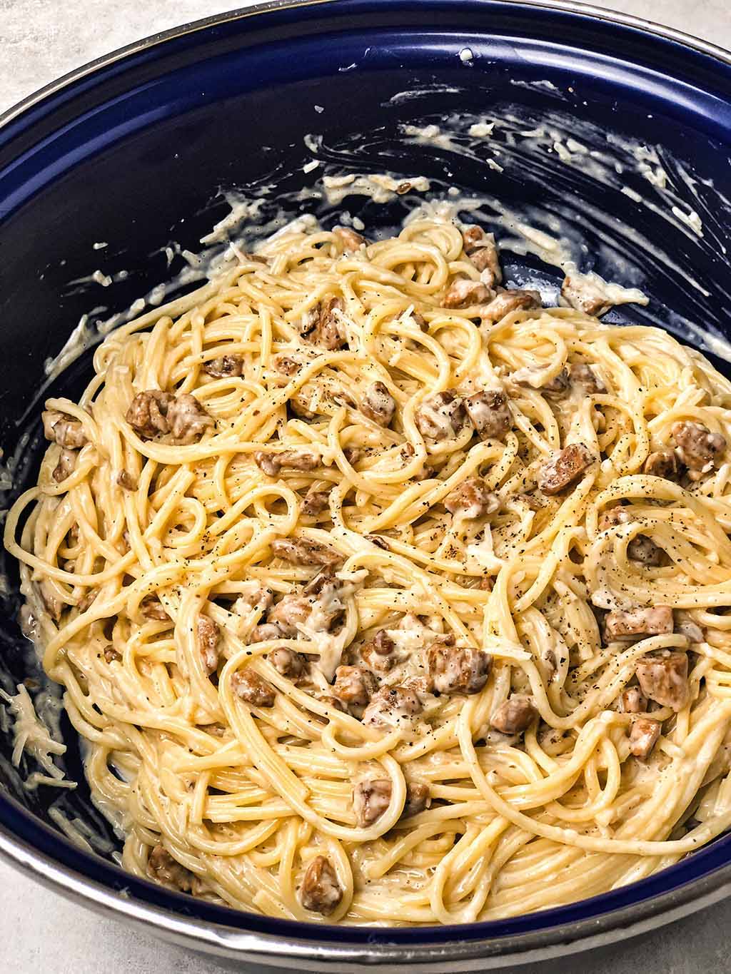 Aber bei dieser veganen Carbonara halten wir uns sowieso nicht an die Regeln, also nimm einfach die Pasta, die dir am besten schmeckt.