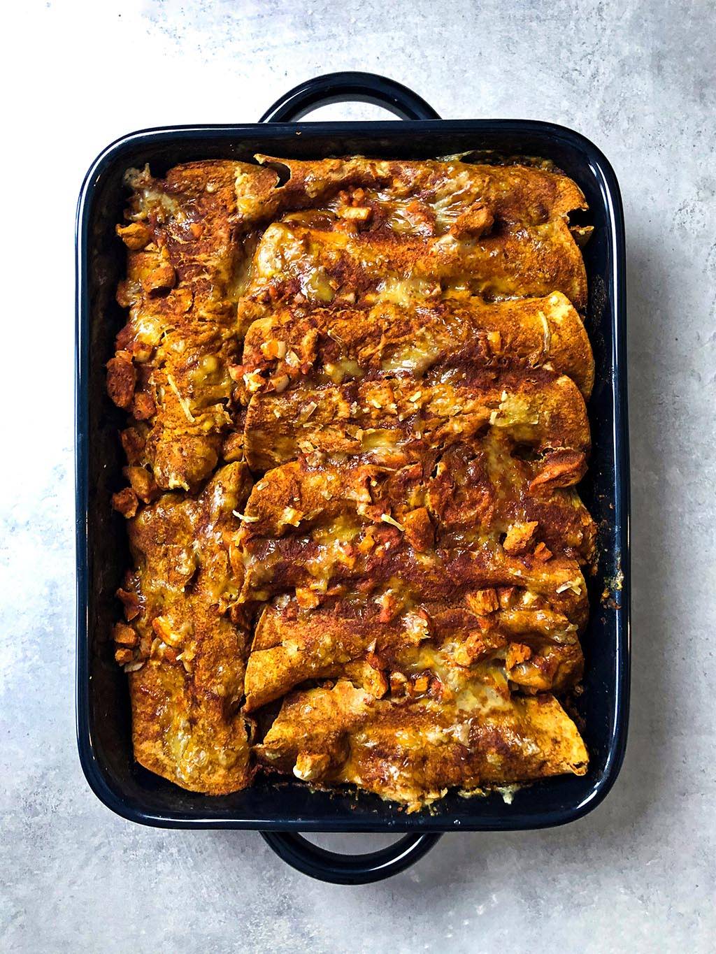 Das Enchilada-Gericht stammt ursprünglich aus Mexiko. Maistortillas werden gefüllt und in einer Auflaufform mit einer roten, scharfen Soße übergossen, die aus Tomaten und roten Paprika besteht. Die Füllung kann aus Fleisch, Kartoffeln und Gemüse bestehen, aber auch Bohnen und Käse werden verwendet. Oft wird es mit Reis und verschiedenen Belägen serviert.