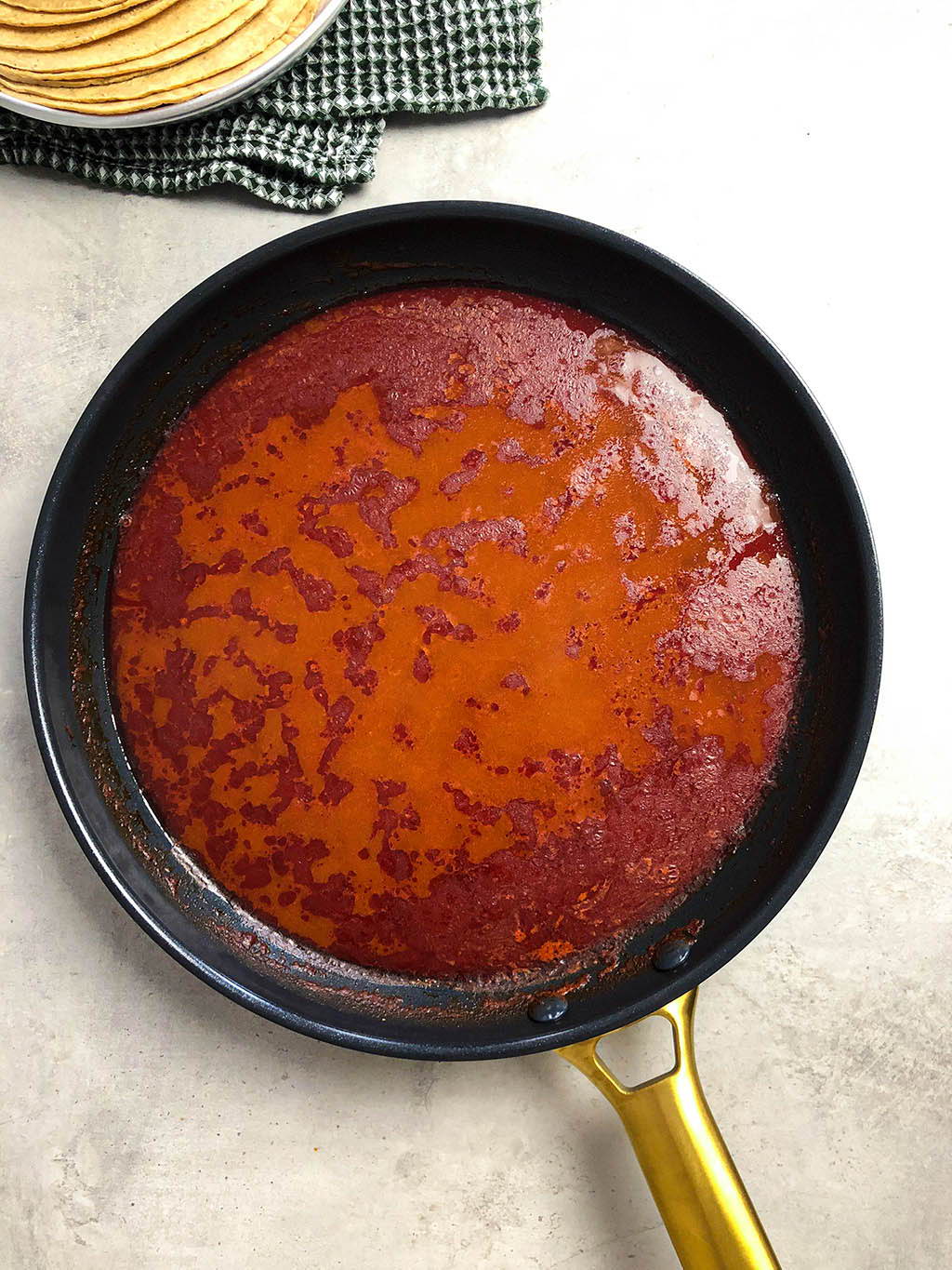 Vegane Enchiladas zuzubereiten ist überhaupt nicht schwer und so unglaublich lecker. Zuerst machen wir die Soße. Dazu braten wir das süße Paprikapulver und das milde Paprikapulver kurz in etwas Pflanzenöl in einer Pfanne an. Dann fügen wir die Passata, das Korianderpulver und das Salz hinzu. Wir bringen alles zum Kochen, reduzieren die Hitze und lassen die Soße köcheln, bis sie etwas eingedickt ist.