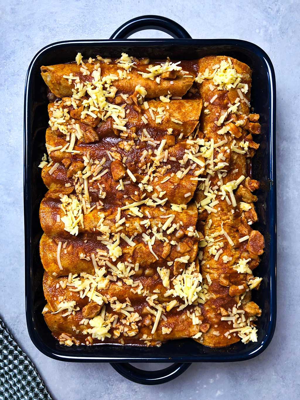 Dann bereiten wir die Maistortillas gemäß den Anweisungen auf der Verpackung zu. Wir geben etwas rote Soße auf den Boden einer Auflaufform (33x21x6 cm) und verstreichen sie gut. Dann füllen wir alle Maistortillas mit veganem geriebenem Käse und etwas Peas Maker Füllung. Diese rollen wir auf und legen sie alle in die Auflaufform. Dann gießen wir langsam den Rest der roten Soße über die aufgerollten Maistortillas, bis alles bedeckt ist. Zum Schluss garnieren wir mit veganem geriebenem Käse und backen die veganen Enchiladas im Ofen.