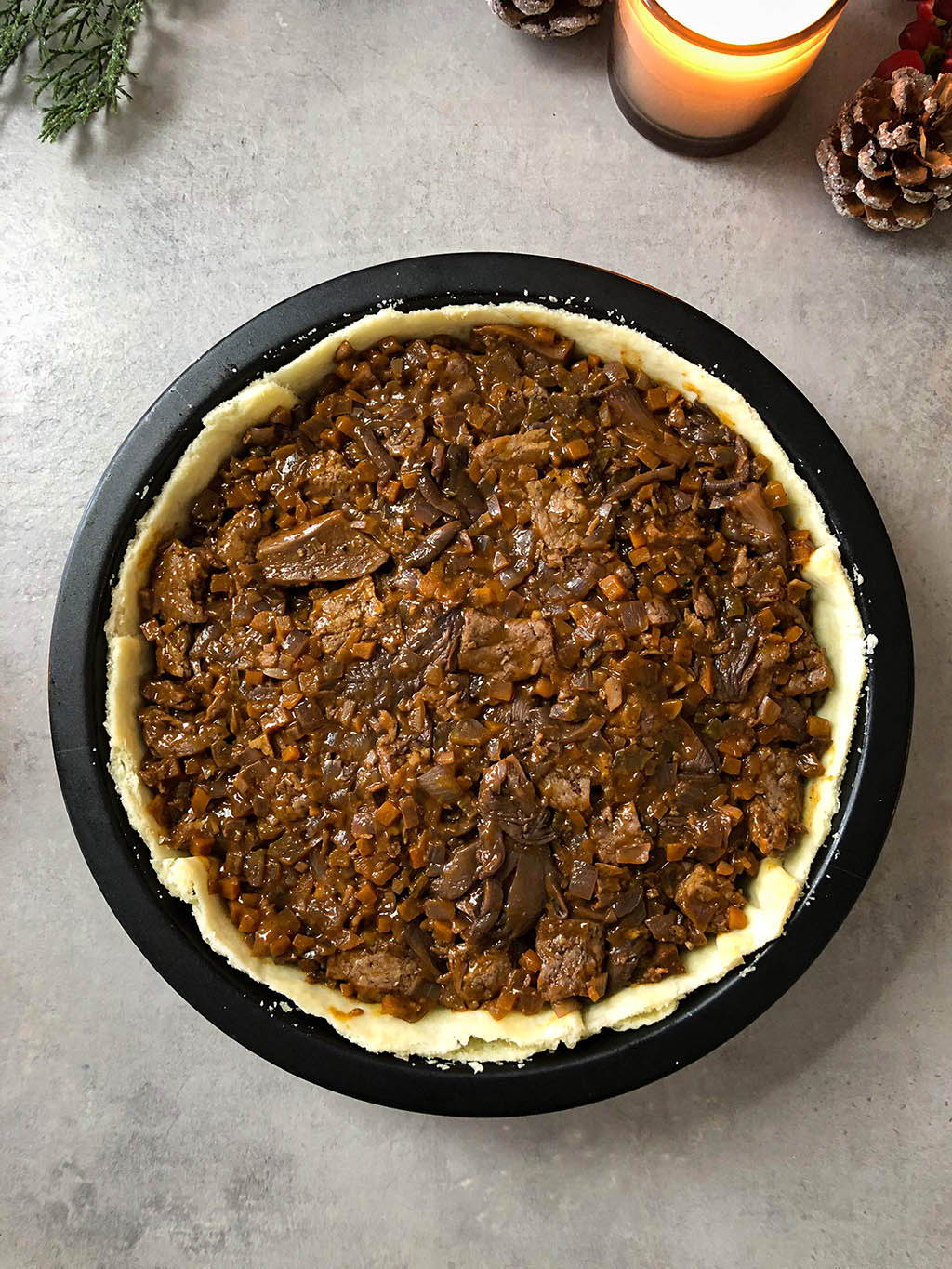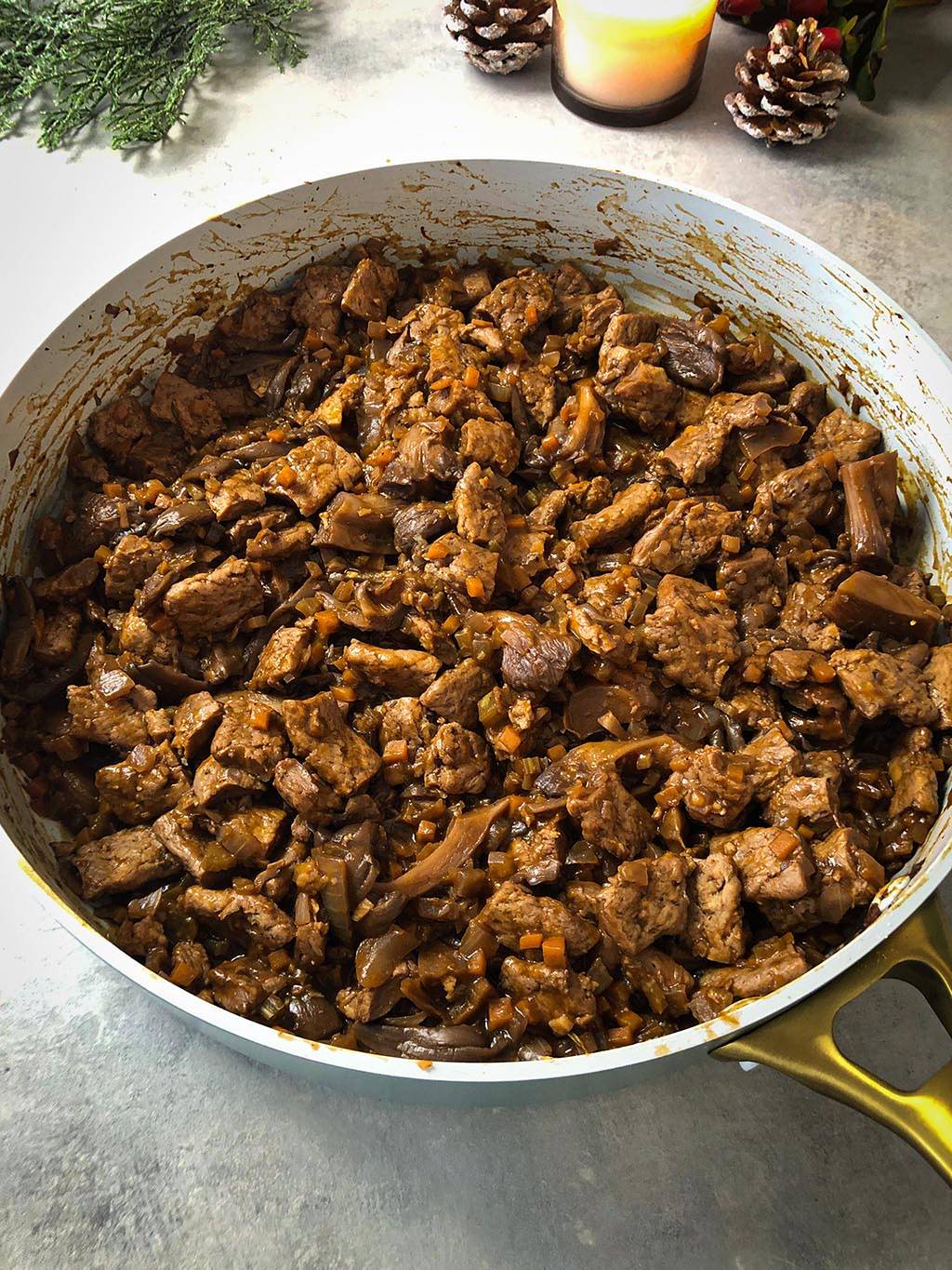 Die Füllung kannst du also problemlos 1-2 Tage im Voraus zubereiten. Lasse die Füllung vollständig auf Raumtemperatur abkühlen und bewahre sie dann abgedeckt im Kühlschrank auf. Wenn du die Fleischpastete essen möchtest, nimmst du die Füllung aus dem Kühlschrank. Dann lass sie auf Raumtemperatur kommen oder erwärme sie kurz in der Mikrowelle oder in einem Topf auf dem Herd, damit die Kälte verschwindet. Anschließend backst du zuerst den Teigboden blind. Danach füllst du die Füllung ein und musst nur noch mit Blätterteig abdecken. Dann kann die vegane Fleischpastete zurück in den Ofen, um weiter zu backen, bis der Blätterteig gar und goldbraun ist.