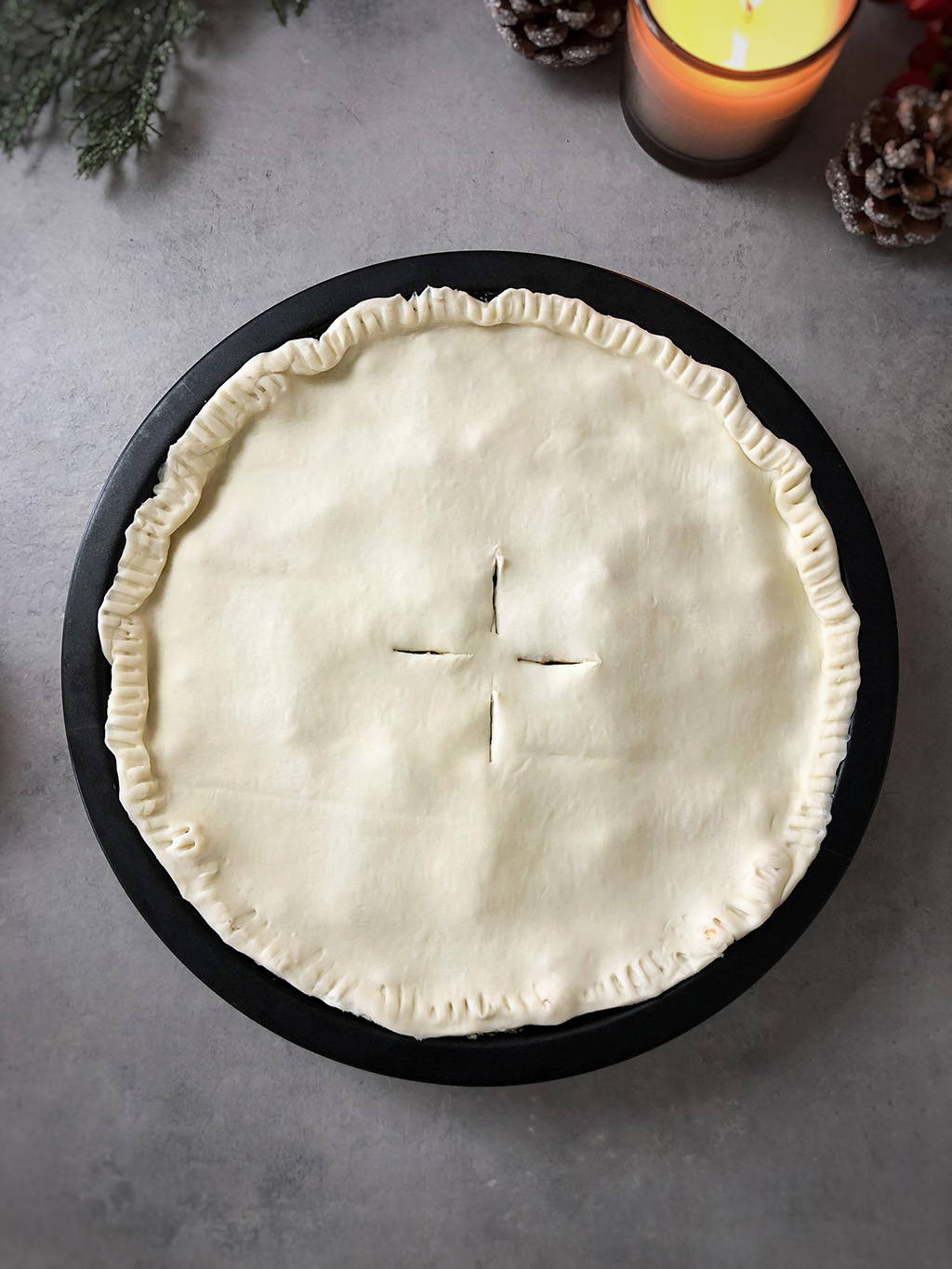 Blätterteig verwenden wir für die Oberseite der veganen Fleischpastete. Dies verleiht einen köstlichen Geschmack und eine knusprige Oberseite. Es ist eine wunderbare Kombination mit dem Rest der Pastete.