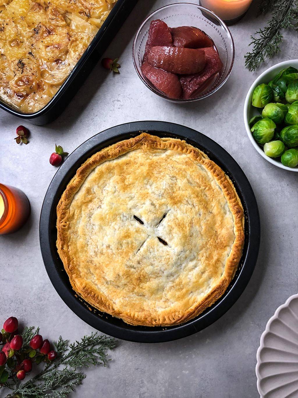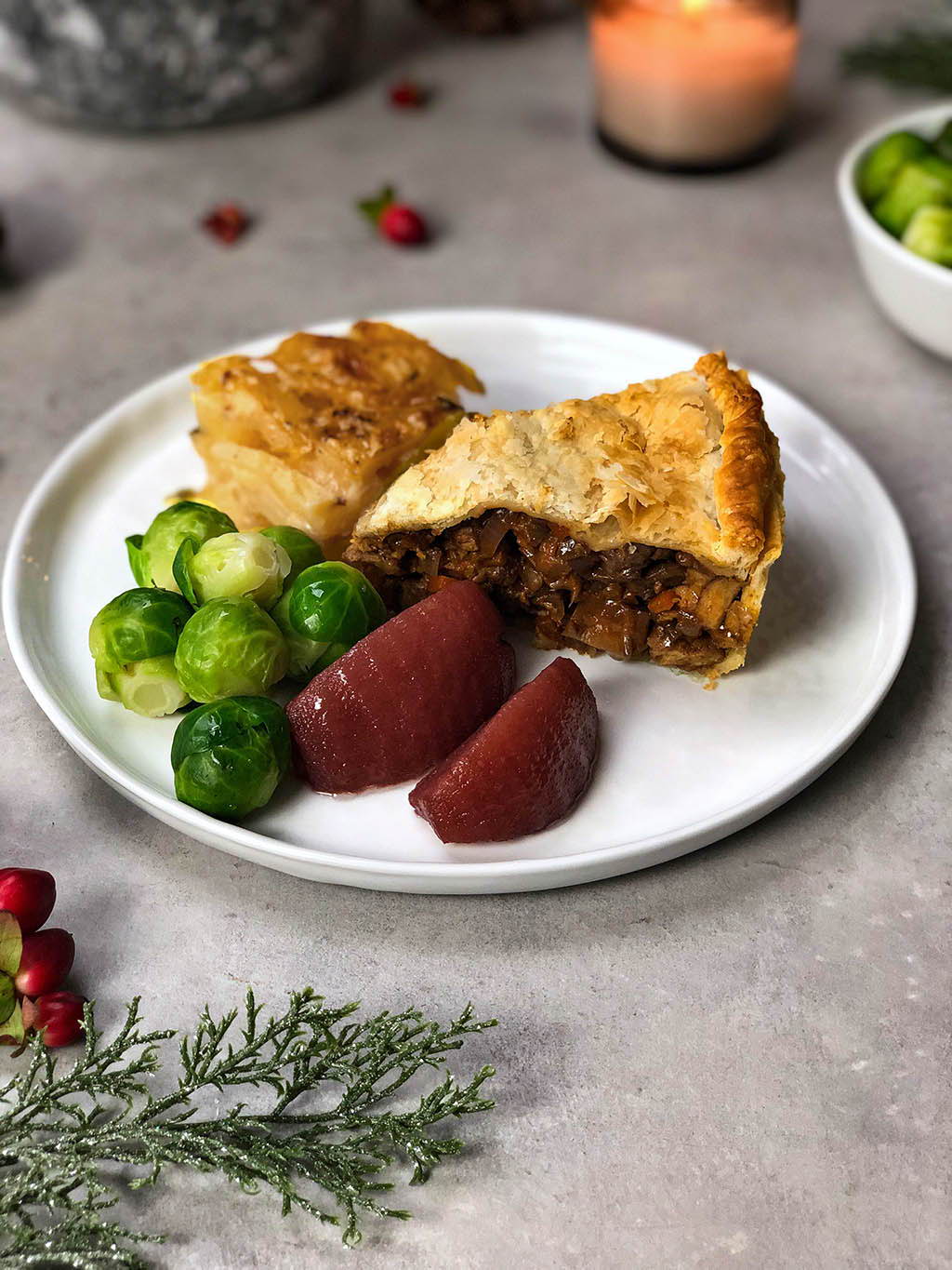 Das in Kombination mit dem knusprig gebackenem Teig schmeckt so gut. Genieße sie zum Beispiel mit veganem Kartoffelgratin, Rosenkohl und geschmorten Birnen. Die Füllung dieser veganen Fleischpastete kannst du auch perfekt vorbereiten. Das macht dieses Gericht besonders praktisch.