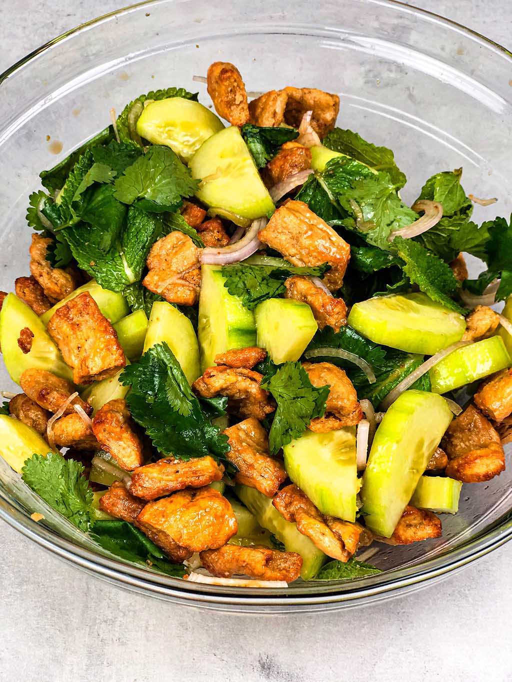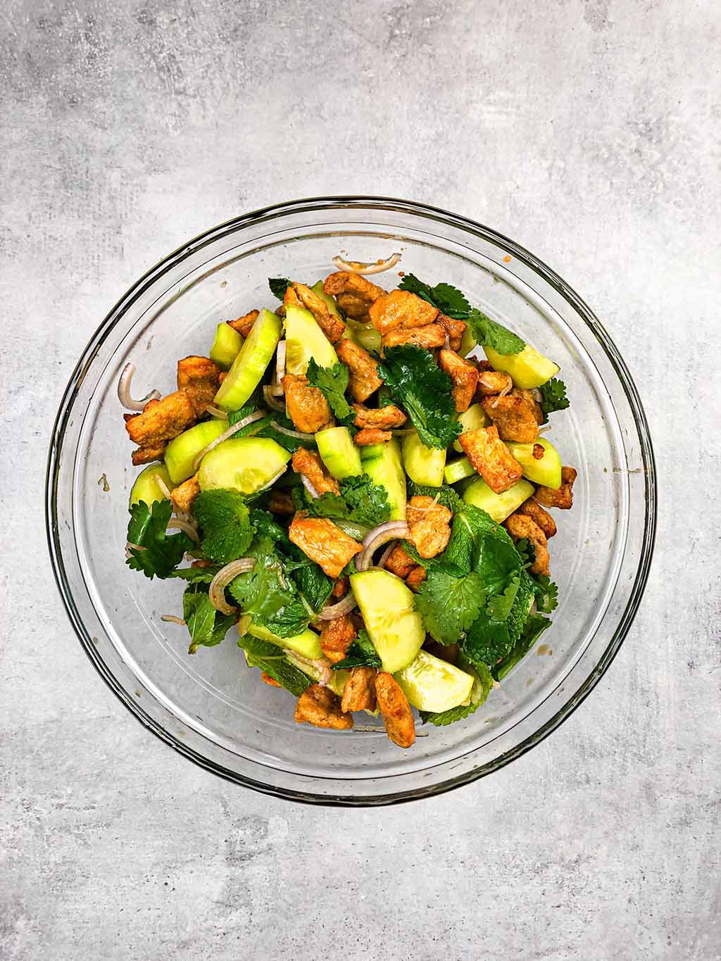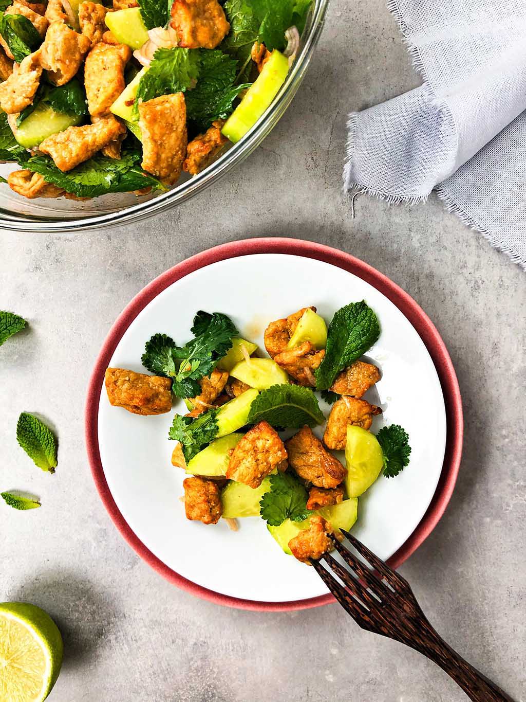 Jetzt kannst du die veganen Hähnchenstücke überall verwenden. In diesem Rezept teilen wir auch die Option, sie in einem thailändischen Salat zu essen. Lecker, einfach und eine echte Geschmacksexplosion!