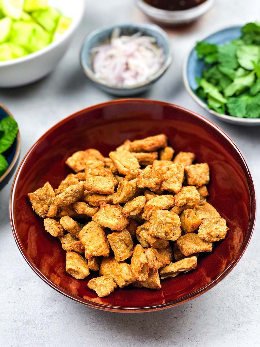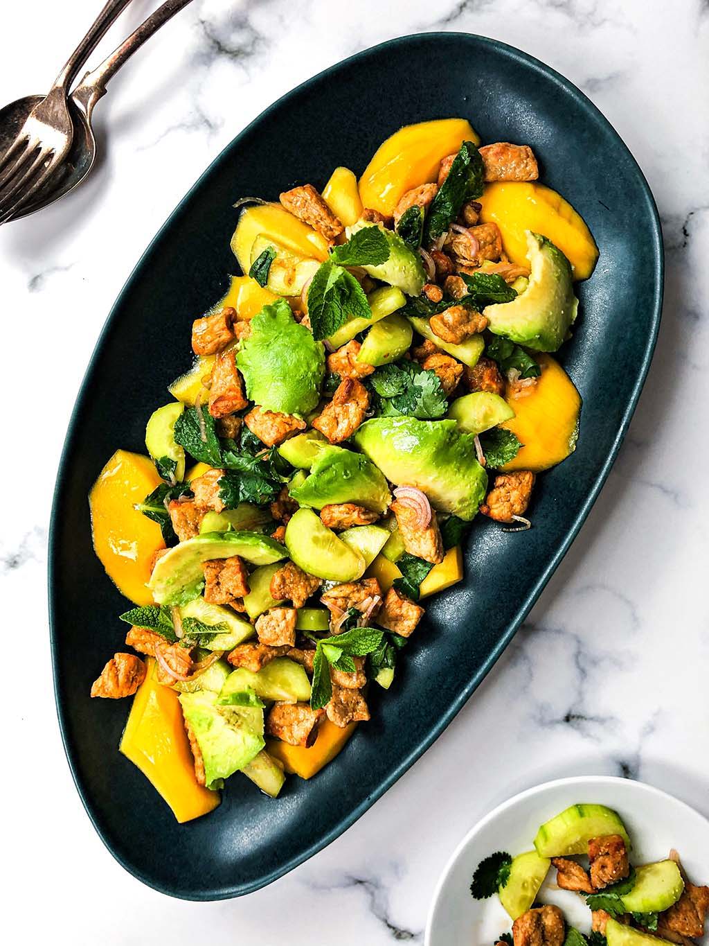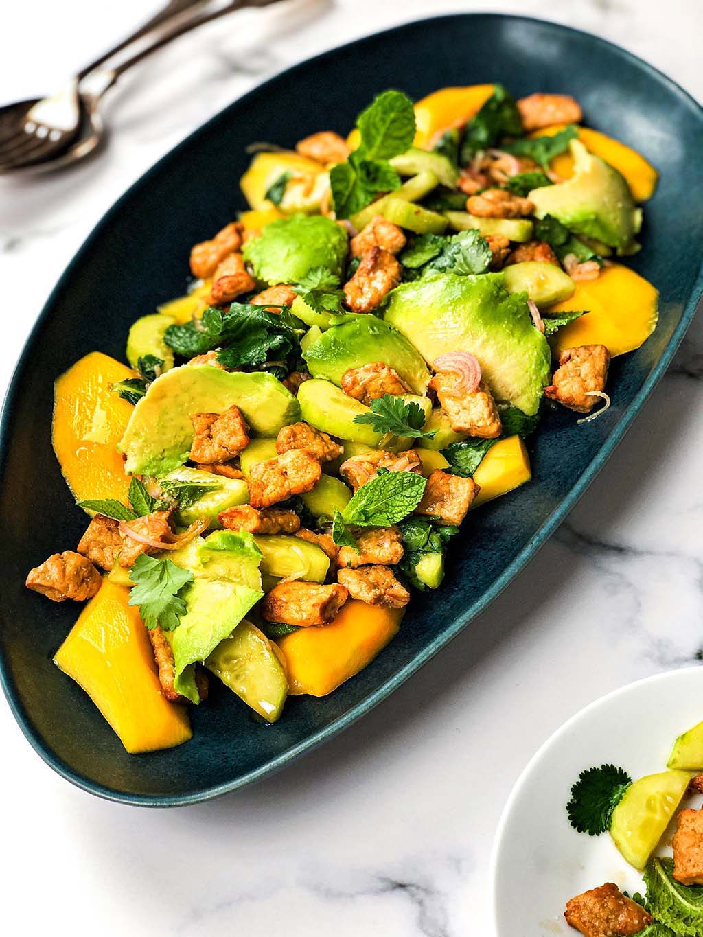 Jetzt kannst du die veganen Hähnchenstücke überall verwenden. In diesem Rezept teilen wir auch die Option, sie in einem thailändischen Salat zu essen. Lecker, einfach und eine echte Geschmacksexplosion!