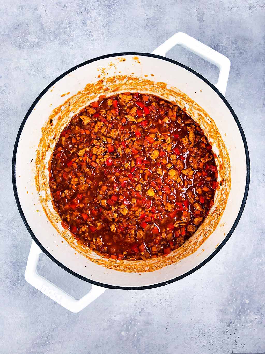 Für diese vegane Lasagne beginnen wir zunächst mit der Tomatensauce. Wir verwenden die Peas Maker Stücke, um das Hackfleisch zu ersetzen. Lasse die Stücke zuerst in kochendem Wasser einweichen und hacke sie dann in kleinere Stücke. Dann brätst du die Stücke in Olivenöl zusammen mit Zwiebeln, Knoblauch, Karotten, roter Paprika, Oregano, Zimtpulver, Salz, schwarzem Pfeffer, Tomatenmark und Wasser an. Lasse die Sauce schön köcheln.