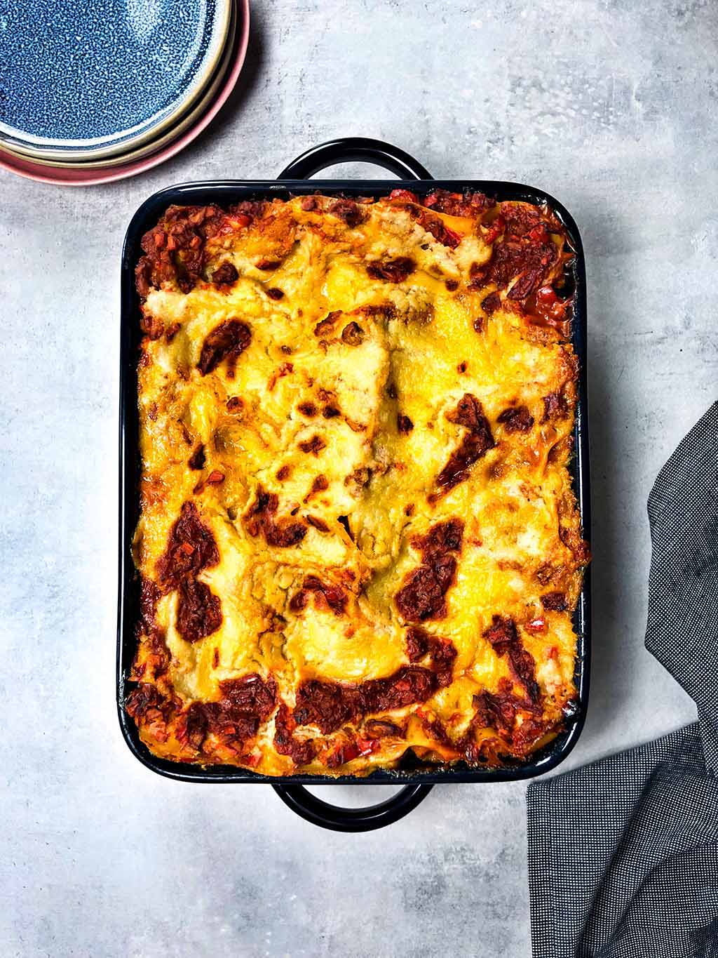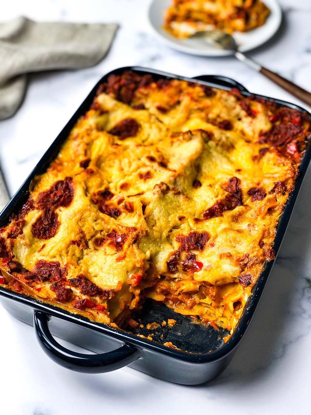 Dieses italienische Gericht wird in vielen Küchen zu Hause zubereitet. Und der Vorteil ist, dass du die Lasagne ganz nach deinem Geschmack anpassen kannst. Diese Lasagne ist komplett pflanzlich und überhaupt nicht schwer zuzubereiten. Ein köstliches Gericht, von dem wir behaupten würden, dass es vielleicht zu einem neuen Favoriten werden könnte.