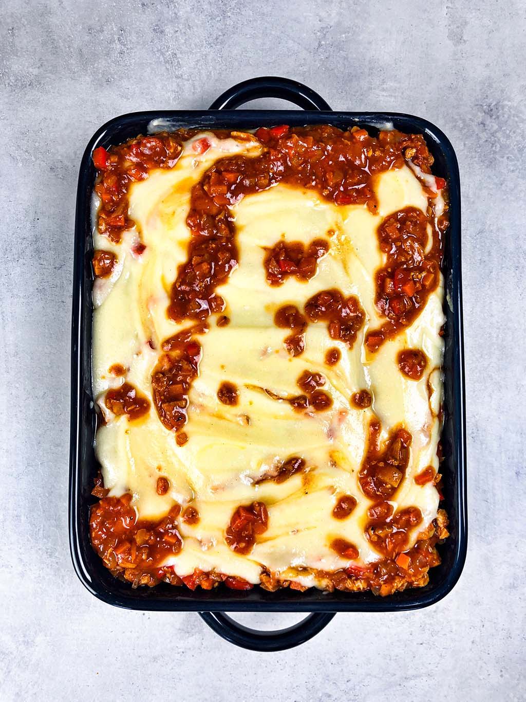 Schöpfe einige Löffel Tomatensauce in die Auflaufform (33 x 21 x 6 cm). Lege darauf 3 Lasagne Blätter, dann die Tomatensauce und dann die vegane Béchamelsauce. Wiederhole dies, bis alles aufgebraucht ist, endend mit der Béchamelsauce und dem letzten Rest der Tomatensauce (siehe Video unten). Backe die Lasagne in der Mitte des Ofens etwa 35 Minuten lang.