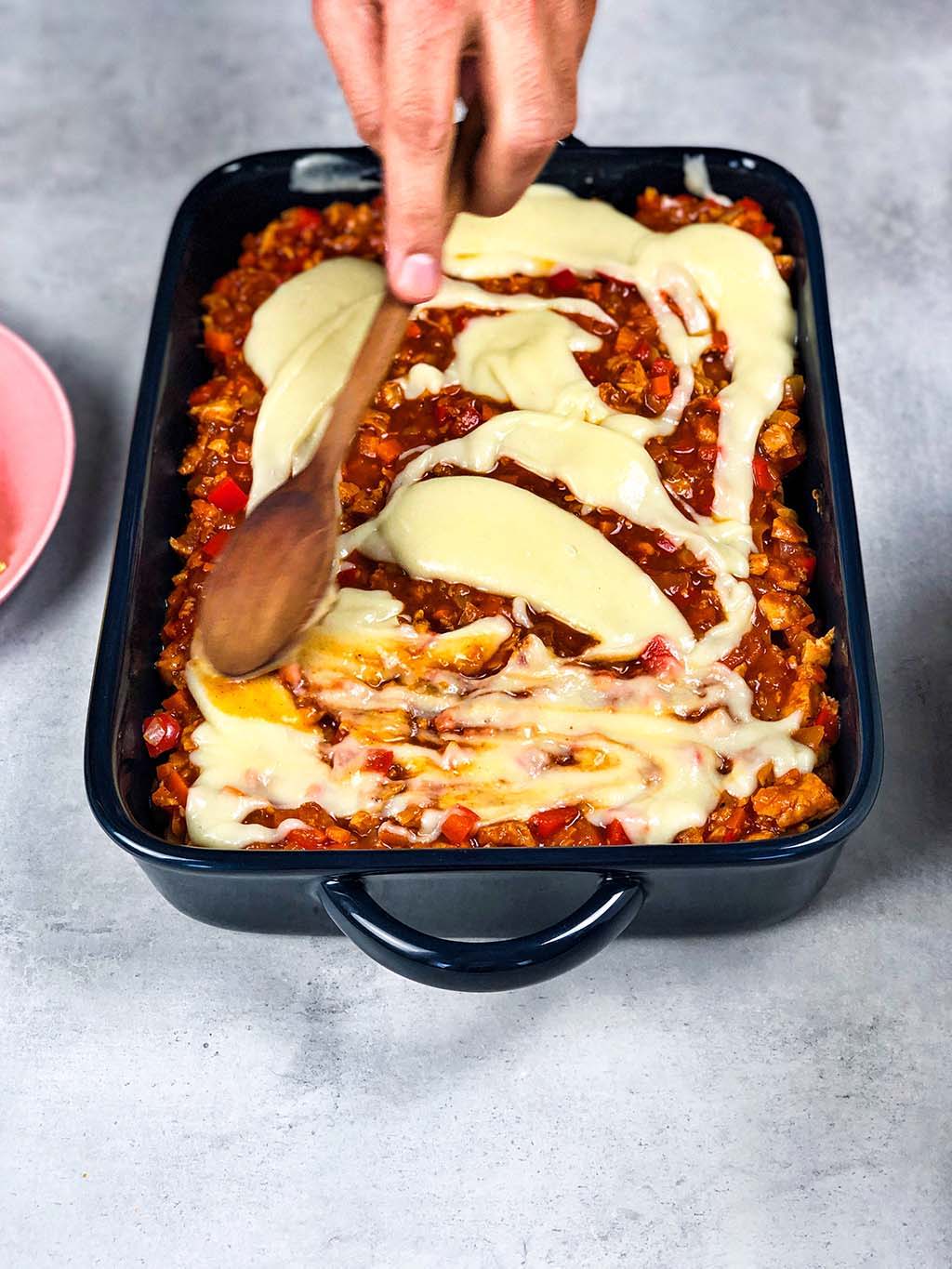 Für die Zubereitung der veganen Béchamelsauce kannst du anstelle von Mehl einfach Arrowrootpulver als Bindemittel für die Sauce verwenden. Stelle sicher, dass du in diesem Rezept die Hälfte weniger Arrowrootpulver verwendest als die Menge an Mehl. In diesem Rezept kannst du also 30 Gramm Arrowrootpulver verwenden. Wir haben uns entschieden, Hafermilch für die vegane Béchamelsauce zu verwenden, weil wir das gerne mögen, aber du kannst natürlich auch problemlos Mandelmilch verwenden. So kannst du diese Lasagne ganz einfach glutenfrei zubereiten.