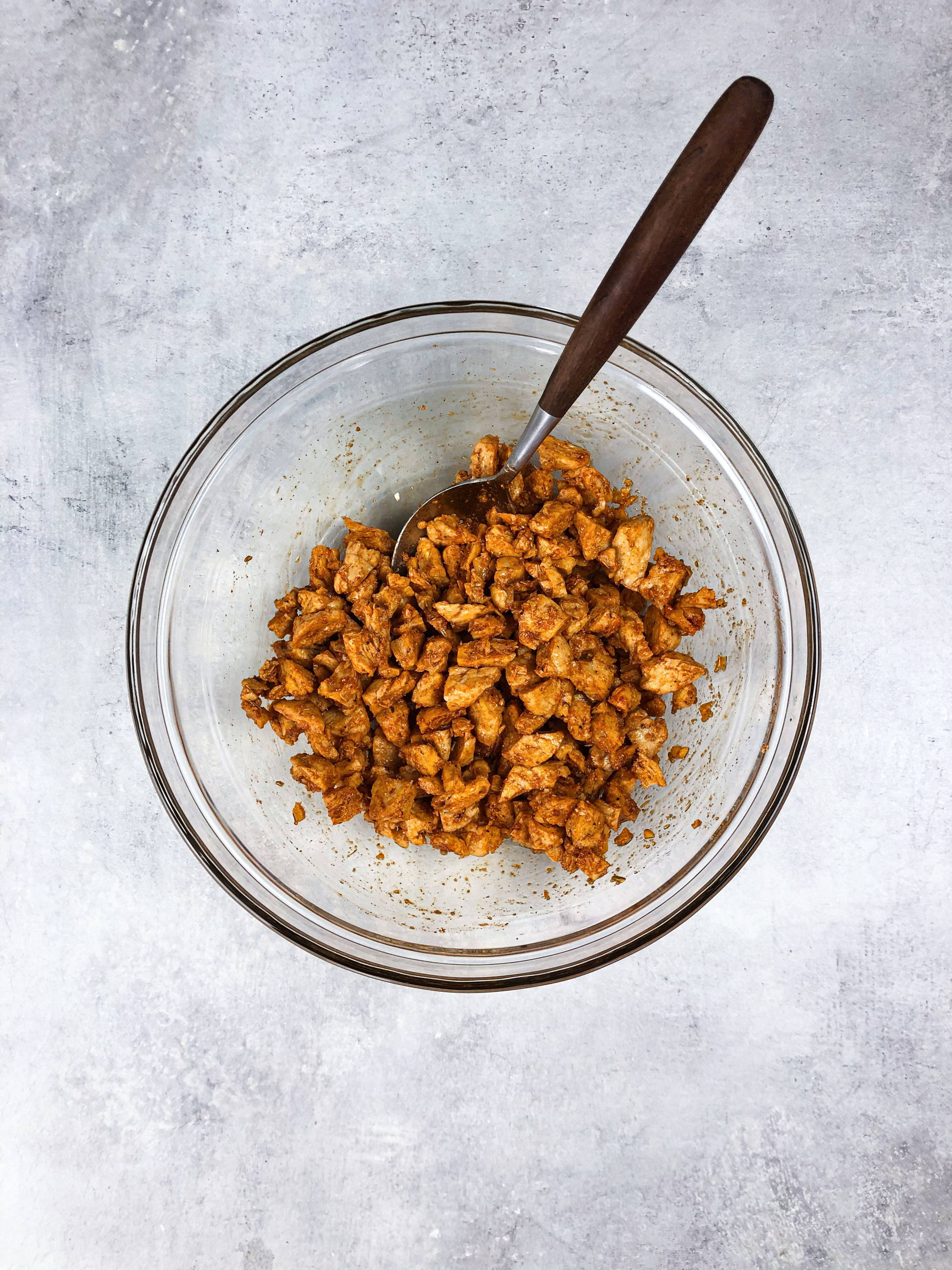 Für den veganen Pepperoni-Belag weichen wir die Peas Maker Stücke etwa 5 Minuten in kochendem Wasser ein. Danach sieben wir die Stücke, hacken sie grob und legen sie zurück in die Schüssel. Dann fügen wir geräuchertes Paprikapulver, zerstoßene Fenchelsamen, Knoblauchpulver, Zwiebelpulver, Salz, Zucker, frisch gemahlenen schwarzen Pfeffer, Apfelessig und pflanzliches Öl hinzu. Wir vermengen alles gut.
