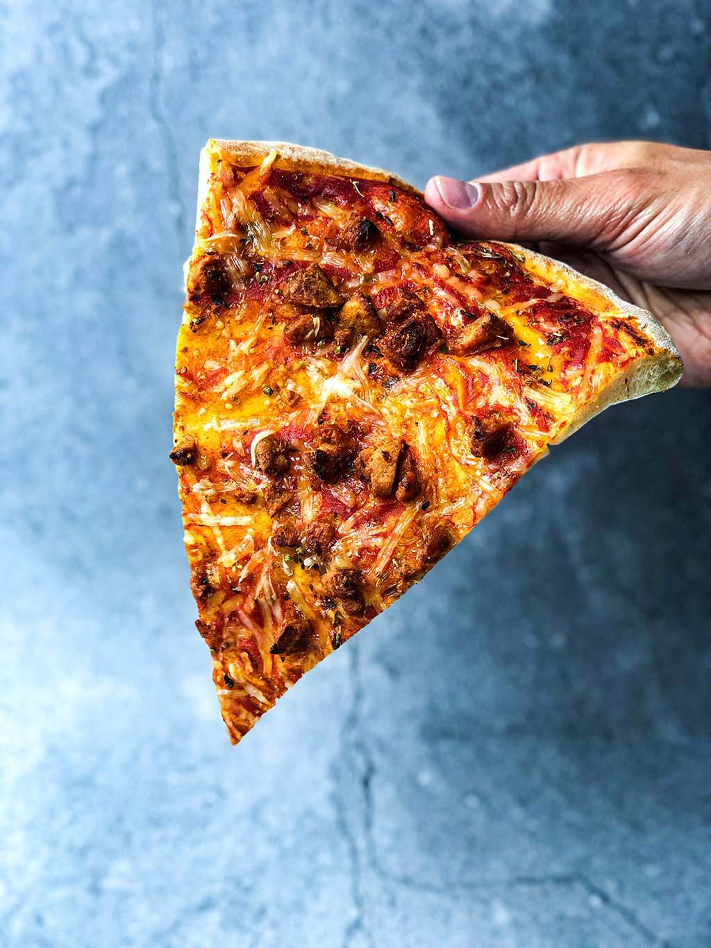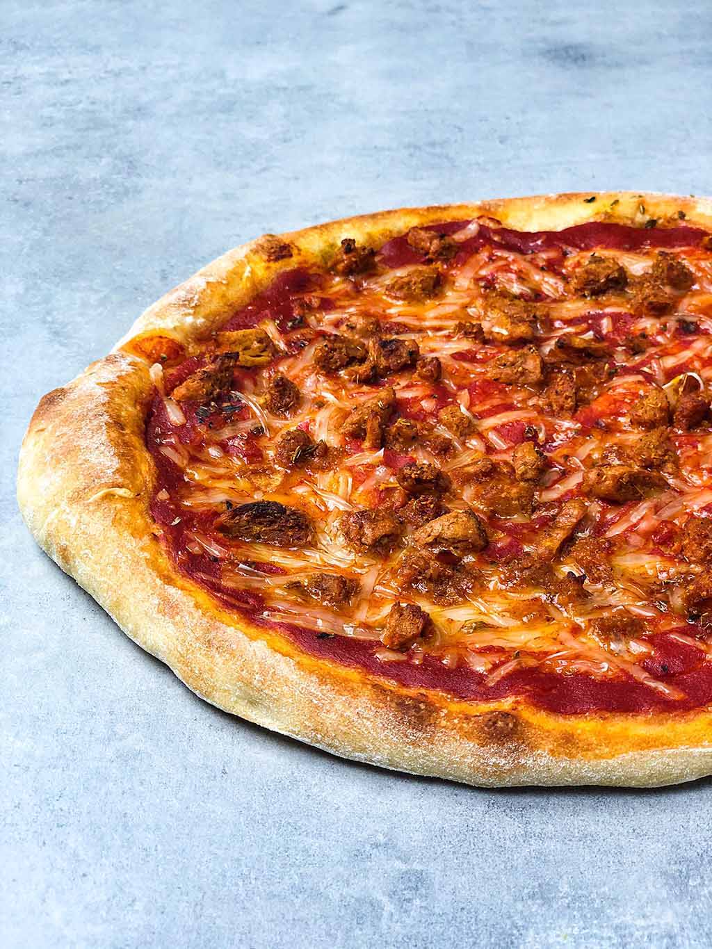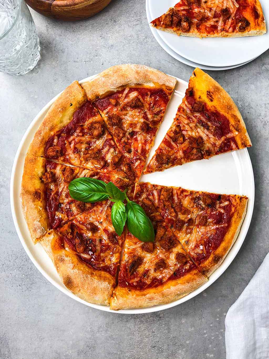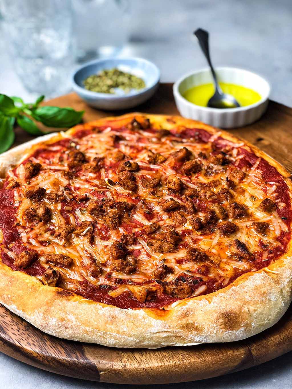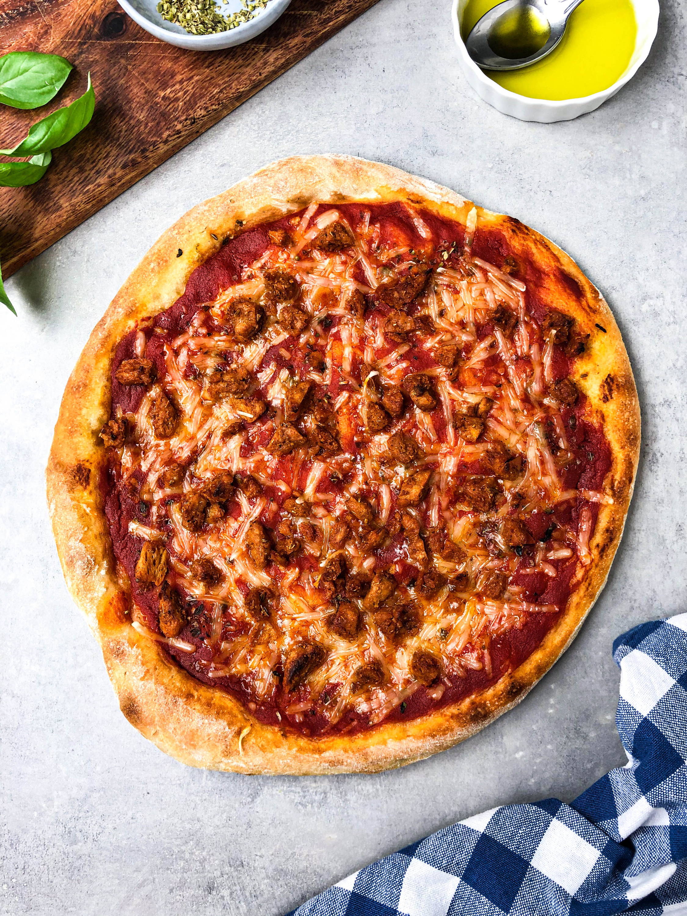 Eine vegane Pizza, aber wie beim Italiener, das möchte doch jeder! Heutzutage gibt es immer mehr vegane Pizzen im Supermarkt zu kaufen, und immer öfter kann man auch eine vegane Pizza bestellen. Aber leider erinnert uns das nicht wirklich an die Pizza von früher, die man beim Italiener bestellte. Und eine Pizza nur mit Gemüse kann lecker sein, aber das meinen wir nicht. Nein, wir meinen eine richtige Comfort-Food-Pizza mit dünnem Teig und knusprigem Rand, bedeckt mit Tomatensauce, geschmolzenem veganem Käse, Oregano, Basilikum und veganer Pepperoni.