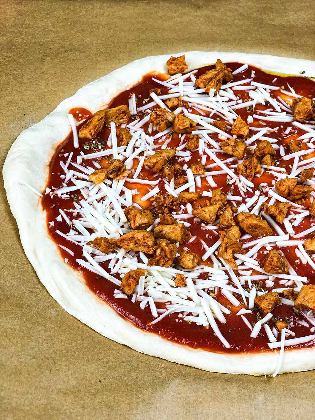 Für den veganen Pepperoni-Belag: Gib die Peas Maker Stücke in eine Schüssel und gieße kochendes Wasser darüber. Lasse sie 5 Minuten einweichen. Abseihen und die Stücke etwas kleiner hacken, dann zurück in die Schüssel legen.
