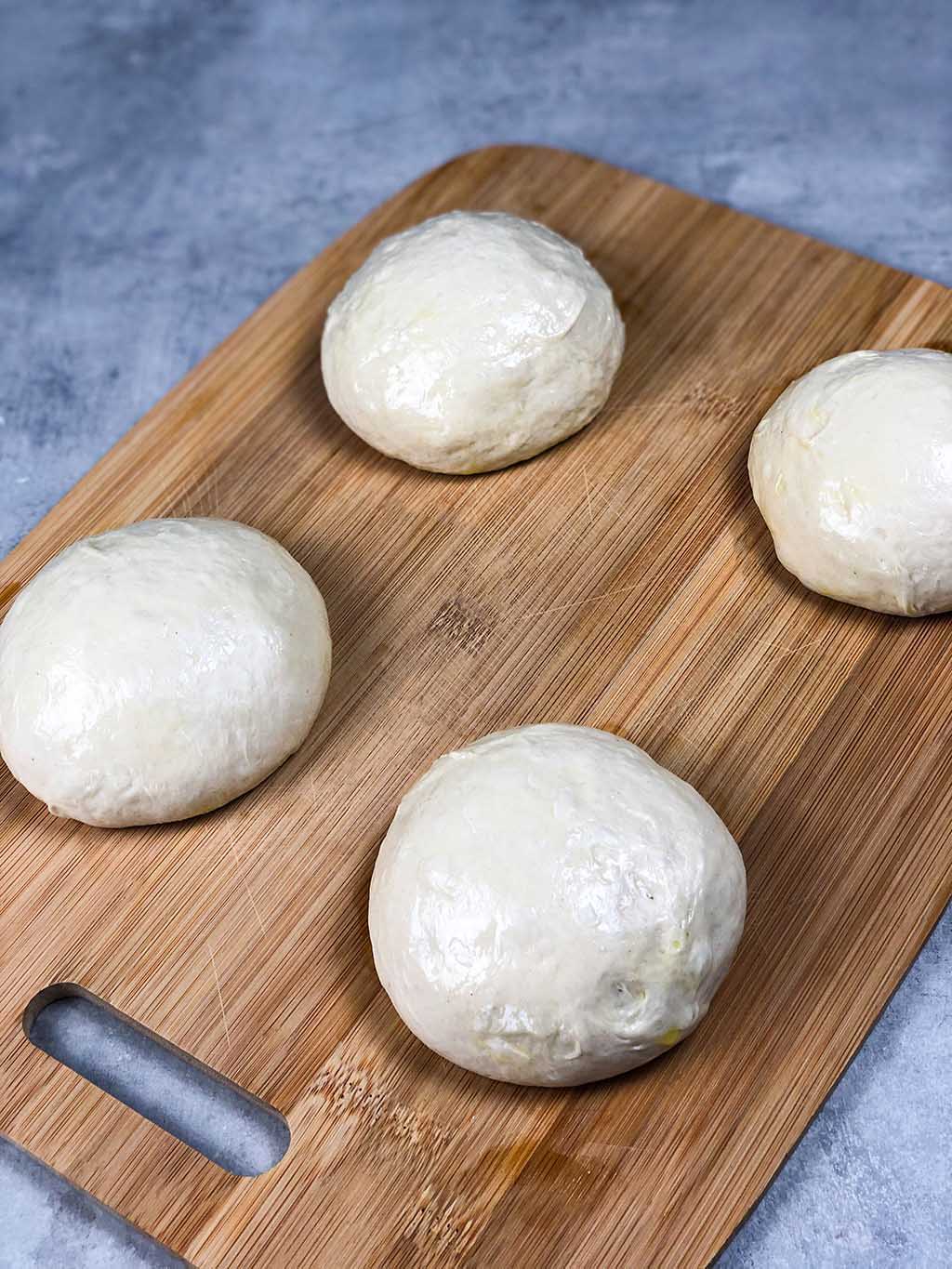 Nimm den Teig aus der Schüssel (das geht sehr einfach mit einem Silikonschaber) und lege ihn auf deine Arbeitsfläche. Fette deine Hände leicht mit etwas Olivenöl ein. Teile den Teig nun in vier Teile und forme runde Teigbälle (siehe im Video unten, wie wir dies zu einer straffen und runden Kugel formen). Bestäube die Teigbälle mit etwas Mehl und decke sie locker mit Frischhaltefolie ab (dadurch bleibt der Teig nicht an der Folie kleben). Lasse den Teig 30 Minuten lang ruhen.