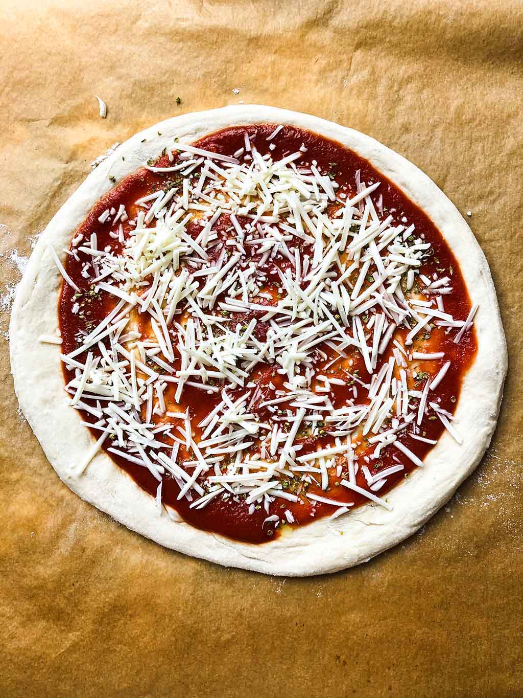 Heize den Backofen auf 260 Grad oder auf die höchste Stufe deines Ofens* vor. Stelle sicher, dass er nicht auf Umluft, sondern auf Ober- und Unterhitze eingestellt ist. Der Ofen sollte gut heiß sein. Erwärme auch das Backblech, auf dem du die Pizza backen wirst, im Ofen.