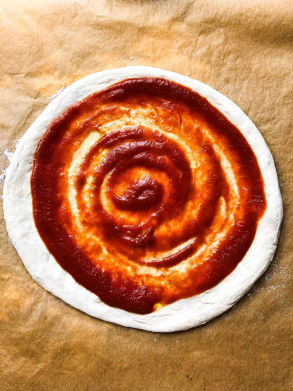 Bestäube deine Arbeitsfläche mit etwas Mehl und lege einen Teigball mit der Oberseite nach unten darauf. Bestäube den Teig ebenfalls mit etwas Mehl und drücke mit deiner Faust in die Mitte des Teigs. Bewege deine Faust in einem Kreis, während du nach außen gehst. Dadurch bleibt der äußere Rand dick, und die meiste Luft bleibt im äußeren Rand. Hebe den Teig an und ziehe ihn vorsichtig auseinander, bis ein größeres Rund entsteht (siehe Video für die genaue Methode). Lege den Pizzateig auf Backpapier.