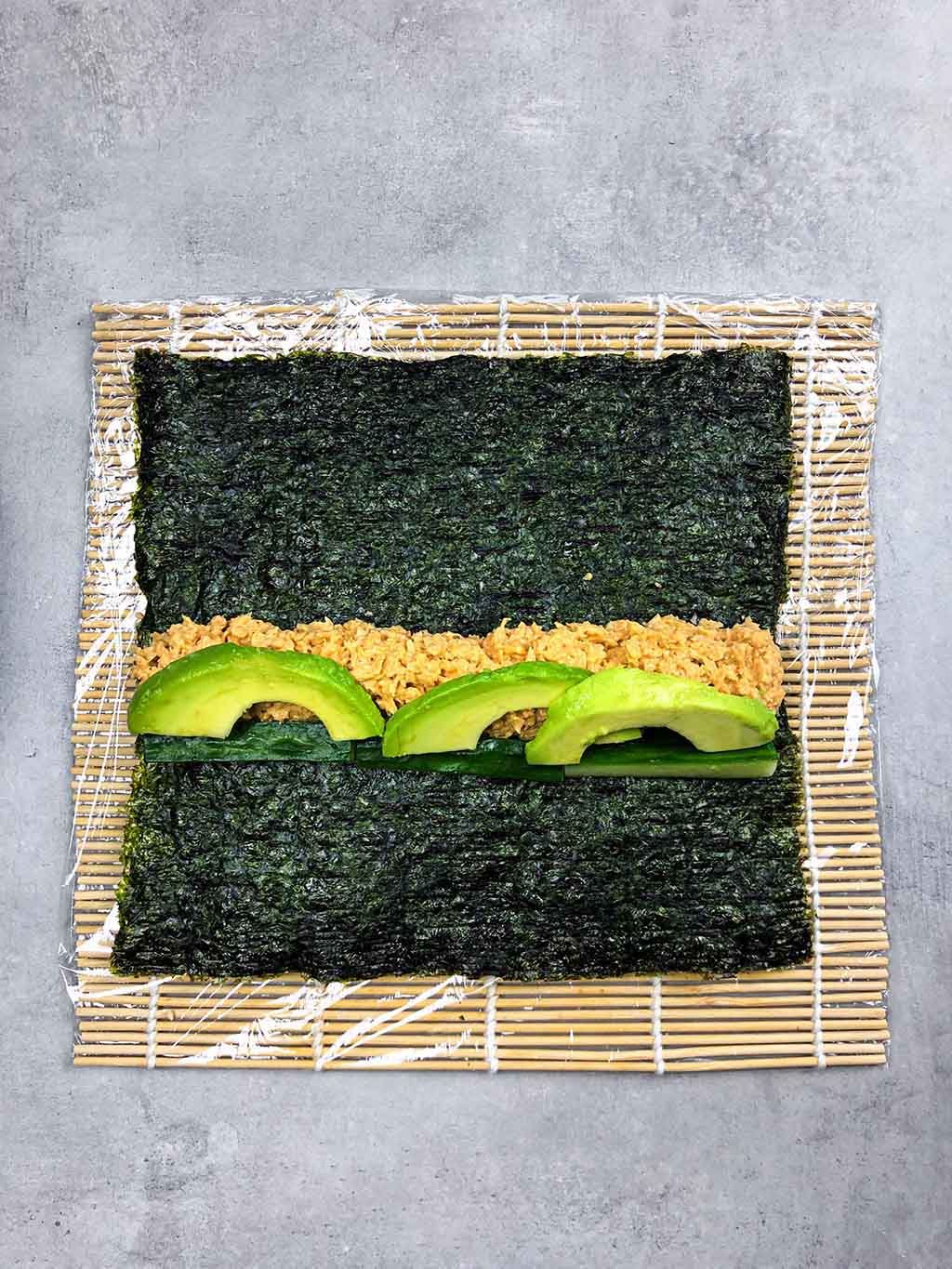 Verteile die Hälfte der veganen "Krabbenfleisch"-Füllung in der Mitte, und lege dann einige Gurken- und Avocadostreifen dazu. Rolle alles mit der Matte fest und schneide die Sushi-Rolle dann in 8 Stücke. Genieße sie mit Sojasauce und Wasabi.