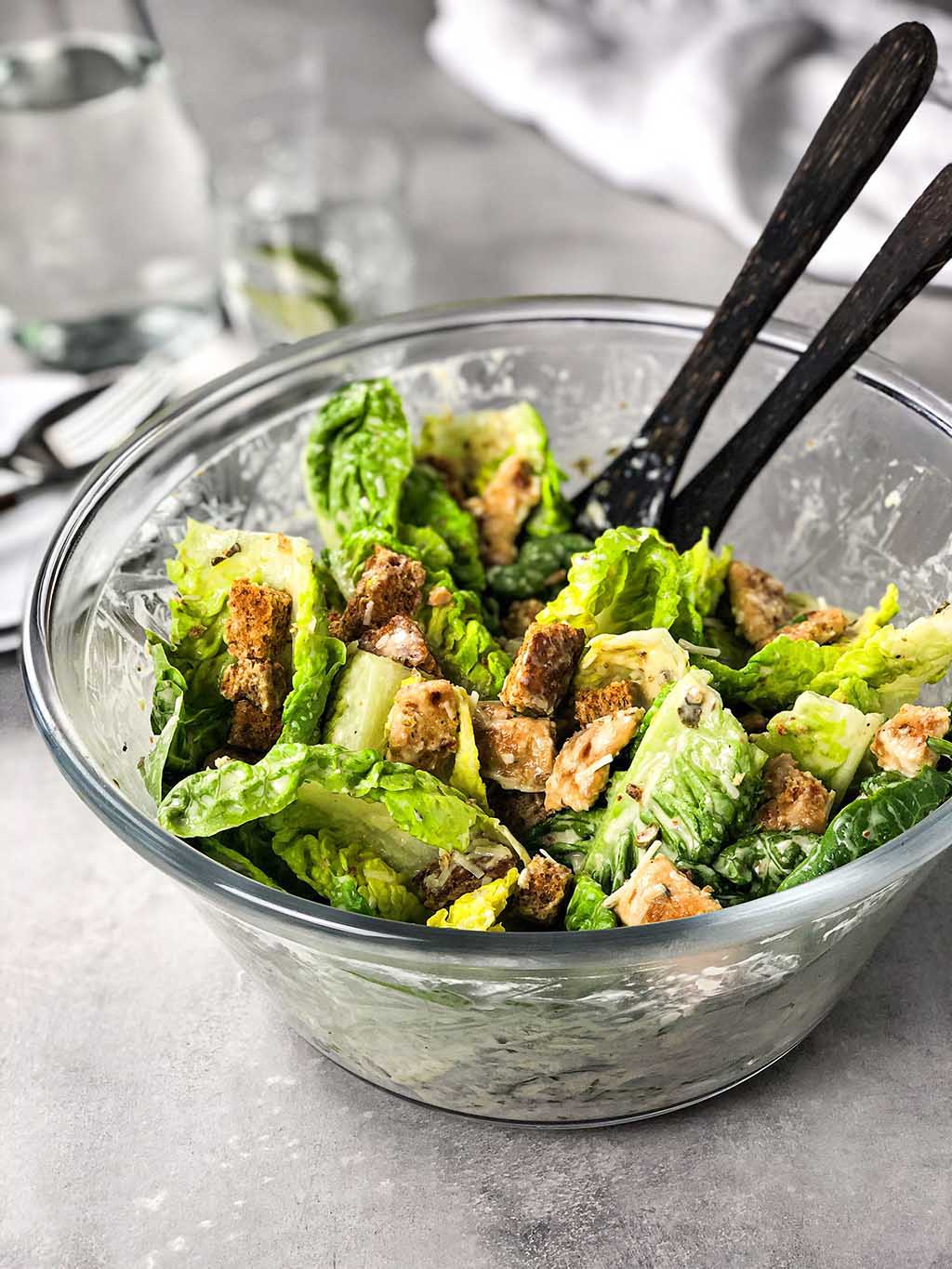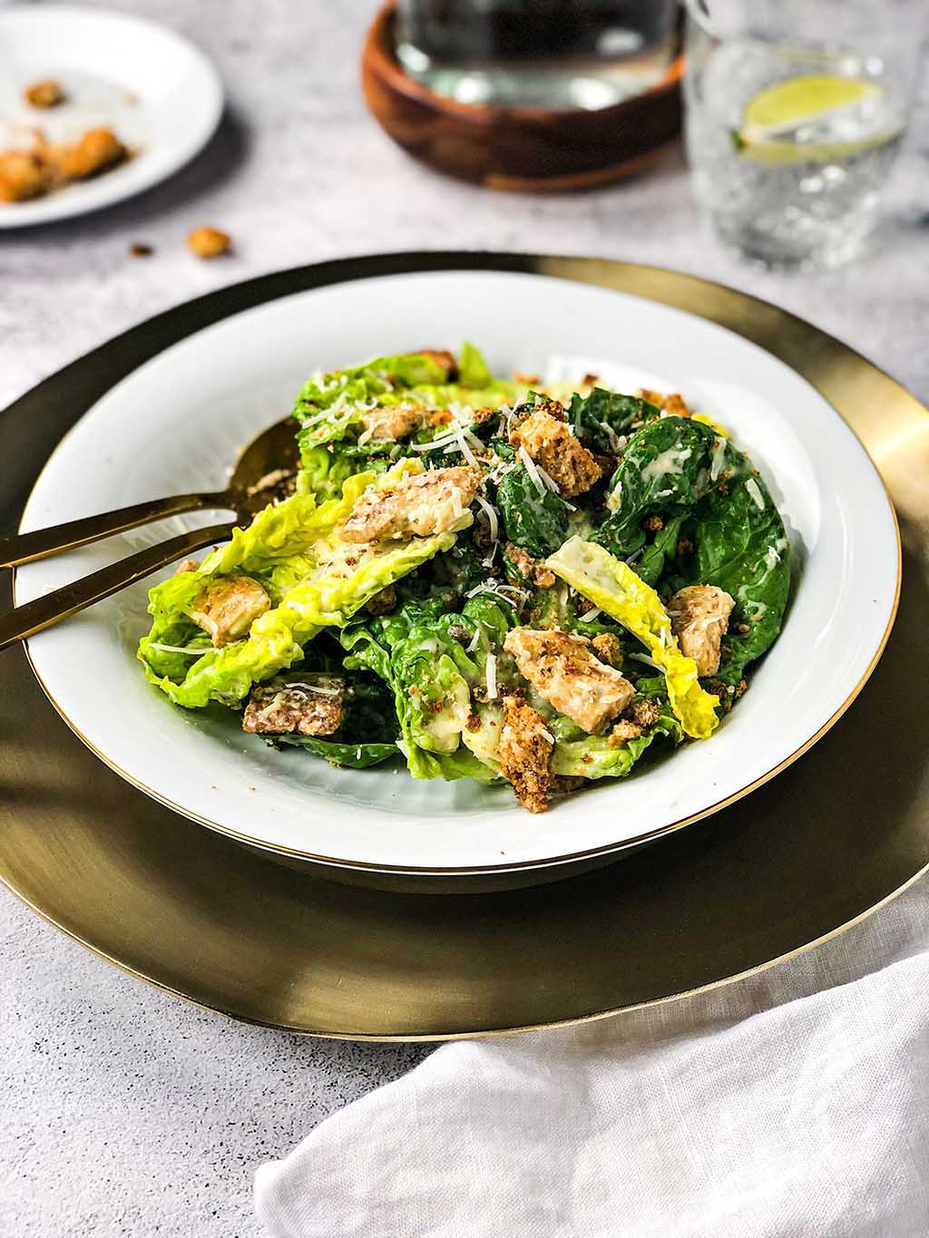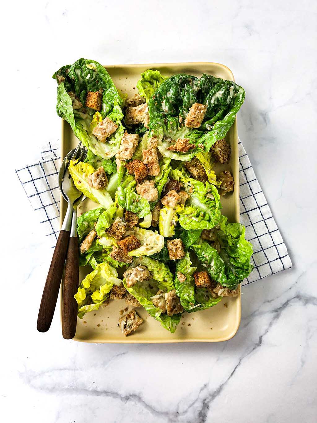 Wann isst du einen veganen Caesar-Salat? Nun, da gibt es keine festen Regeln. Du kannst ihn essen, wann immer du möchtest. Dieser Salat ist aufgrund seiner super cremigen Konsistenz, seines vollen Geschmacks und seines Reichtums an Proteinen und Ballaststoffen durchaus als vollwertige Mahlzeit geeignet. Du kannst ihn also problemlos zum Mittagessen essen. Aber natürlich auch als Abendessen. Du kannst ihn beispielsweise gut mit einer Suppe kombinieren. Aber dieser vegane Caesar-Salat eignet sich auch perfekt als Beilage. Er schmeckt zum Beispiel hervorragend zu den folgenden italienischen Gerichten, die wir ebenfalls auf der Website teilen: veganes Cacciatore, Pasta Ragu, vegane Pizza, vegane Carbonara oder vegane Bolognese.