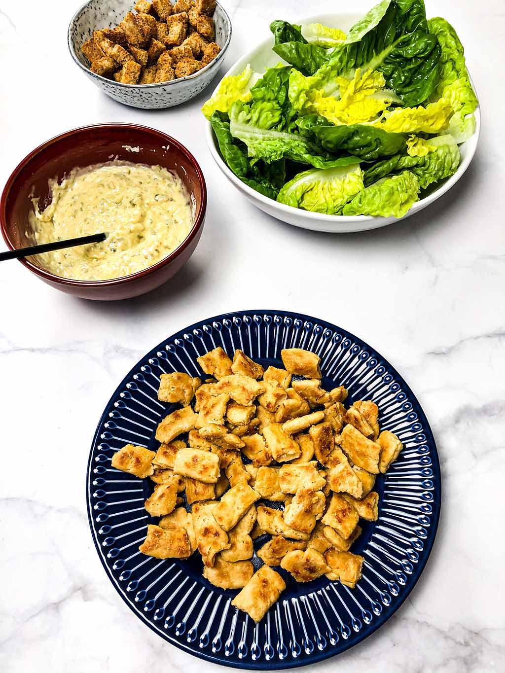 Die Zubereitung eines veganen Caesar-Salats ist sicherlich nicht schwer, aber du kannst sie eigentlich in drei Schritte unterteilen. Du machst die Croutons, das Dressing und die veganen "Hühnerstückchen".