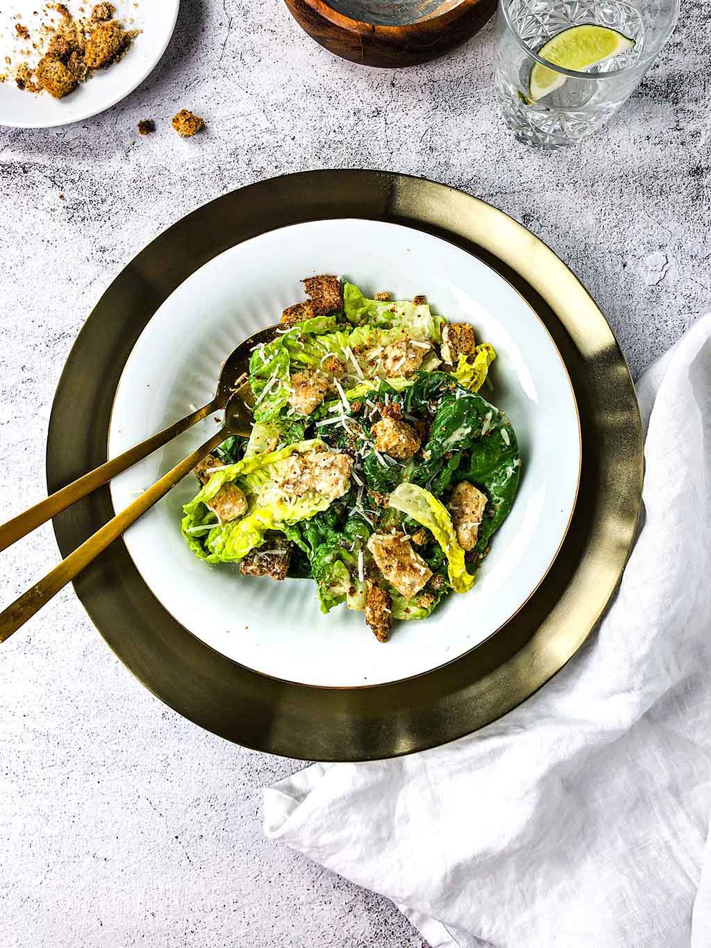 Später im Jahr 1929 fügte Caesars Bruder Alex dem Salat Anchovis hinzu. Das wurde sofort ein Hit, und so wird der Salat noch heute zubereitet. Es gibt jedoch heutzutage unzählige Variationen und verschiedene Zutaten und Geschmacksrichtungen, die dem Salat hinzugefügt werden. Deshalb zeigen wir dir gerne unsere vegane Version.