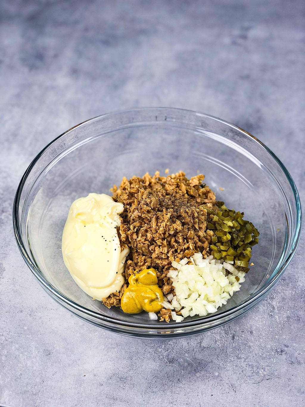 Füge vegane Mayonnaise und Senf zur Schüssel hinzu. Schneide die Gewürzgurke und die weiße Zwiebel in gleichmäßige kleine Würfel und gib sie ebenfalls zur Schüssel. Füge frisch gemahlenen schwarzen Pfeffer hinzu. Bewahre den veganen Thunfischsalat verschlossen im Kühlschrank auf.
