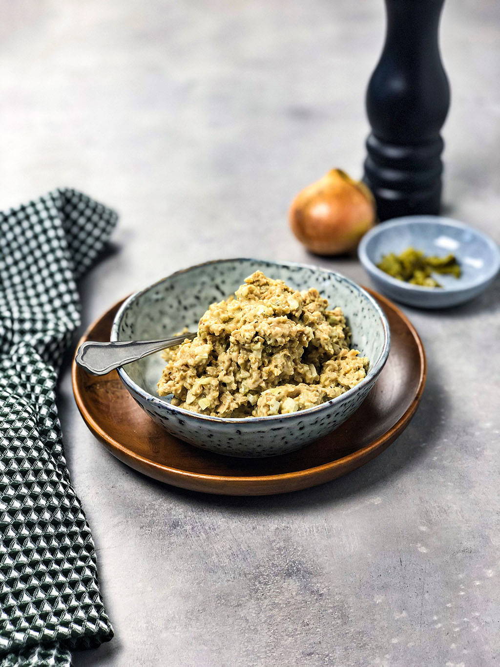Du kannst den veganen Thunfischsalat problemlos einige Tage im Kühlschrank aufbewahren. Stelle sicher, dass du ihn abgedeckt aufbewahrst. Wenn der vegane Thunfischsalat kälter wird, wird er auch fester in der Konsistenz. Füge einfach etwas Wasser hinzu und rühre gut um, bis die gewünschte Konsistenz erreicht ist.